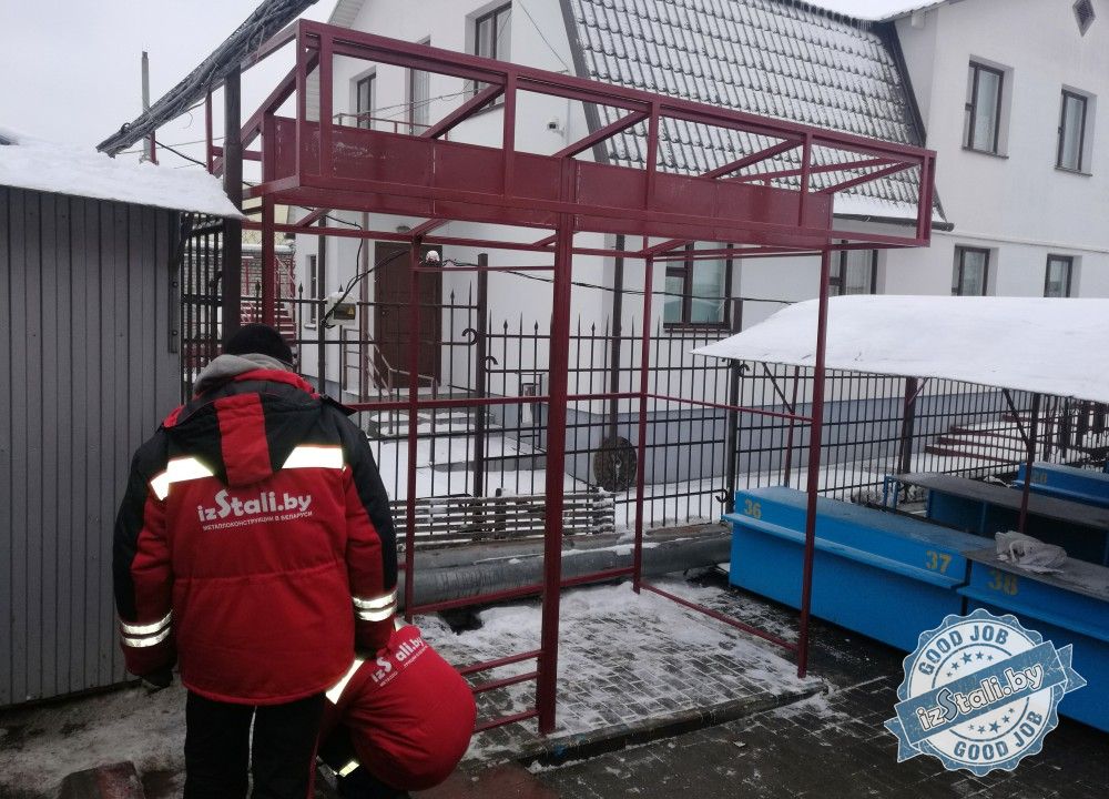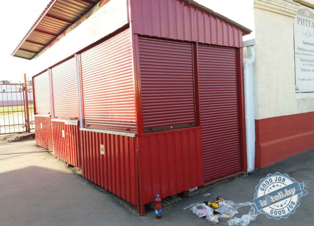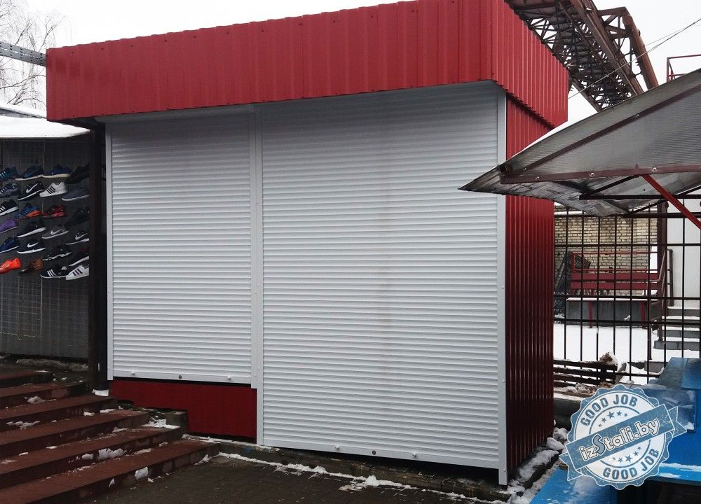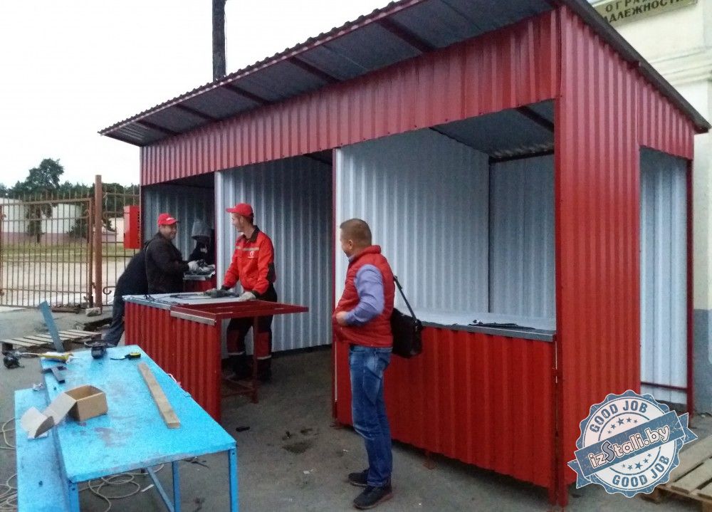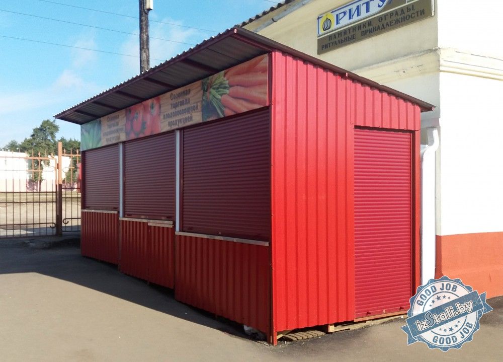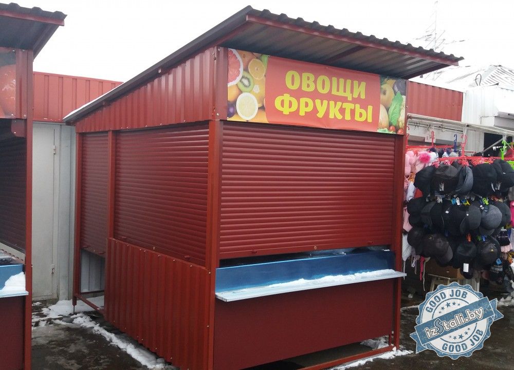 Торговый павильон изготовлен из стального каркаса обшитого листами металлопрофиля в полимерном покрытии. Металлокаркас обработан грунтом с последующим окрашиванием. Внутри палильона установлены торговые столы с рабочей поверхностью из пищевой нержавеющей стали. На окна и двери установлены защитные роллеты. Кроме основных защитных свойств, роллеты защищают помещение с товарами от пыли, шума, ветра, солнца и света. Данные роллеты служат долго даже при интенсивной эксплуатации.