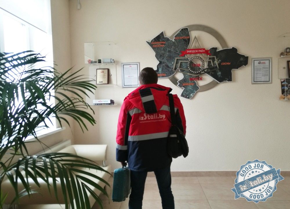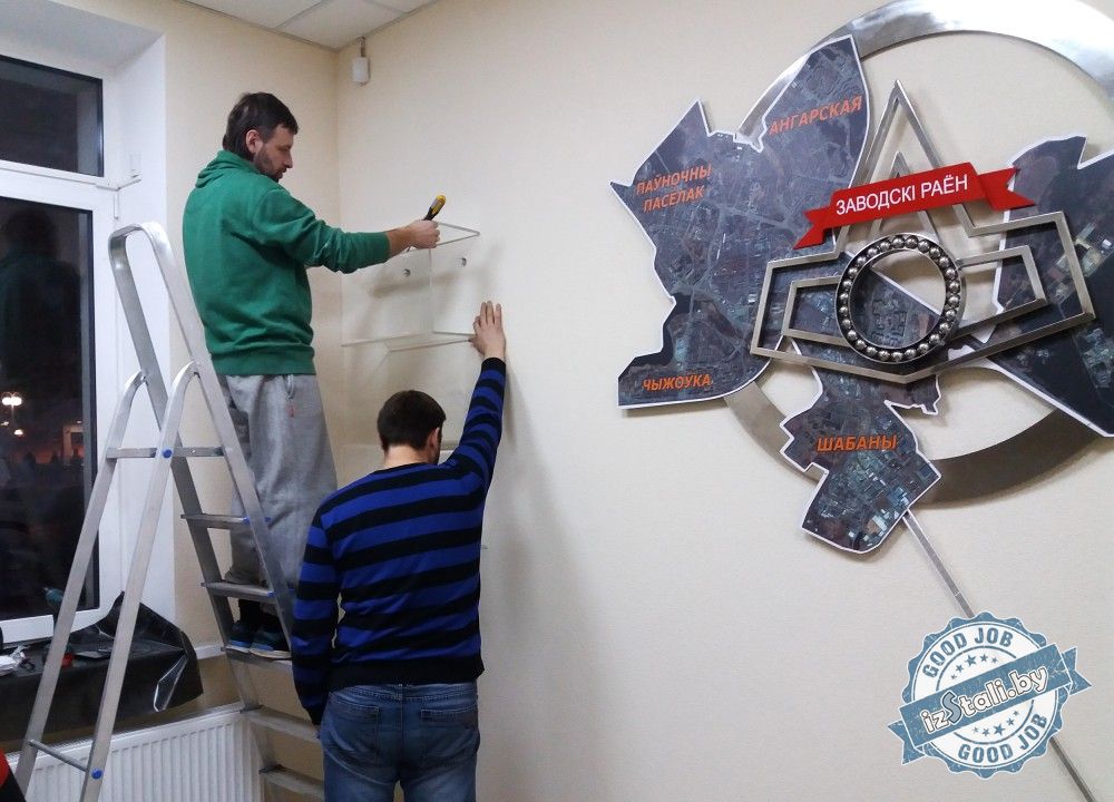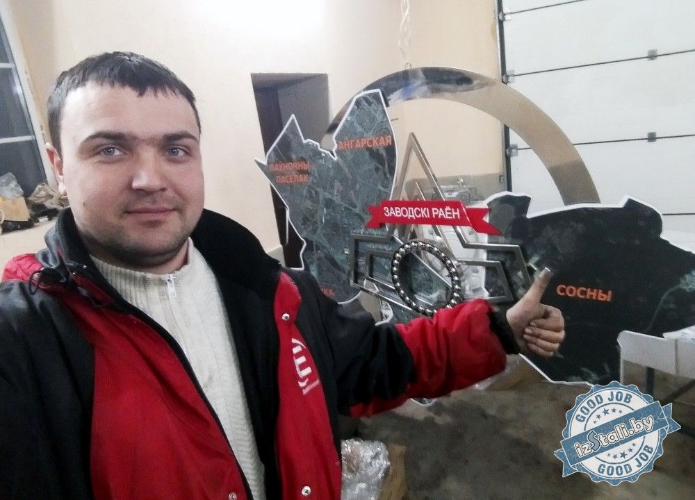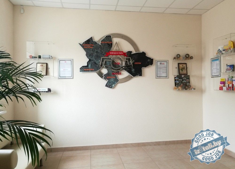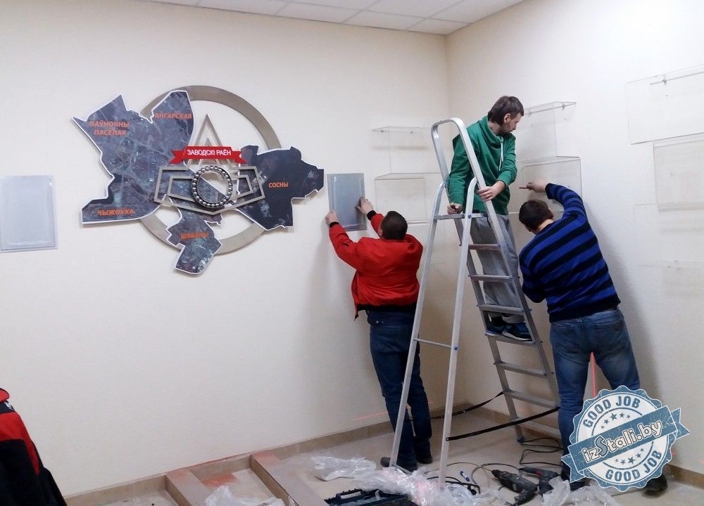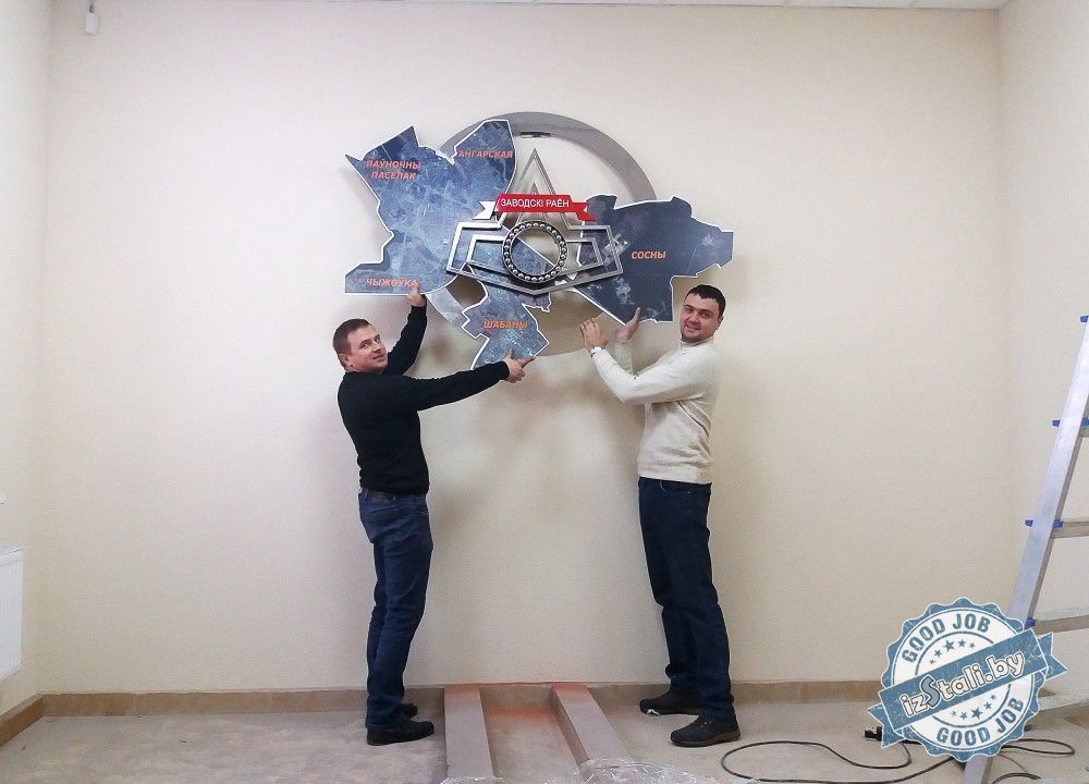 В итоге полученная эмблема ручной работы, сделанная талантливыми белорусскими мастерами, украшает главный холл Администрации Заводского района г.Минска.