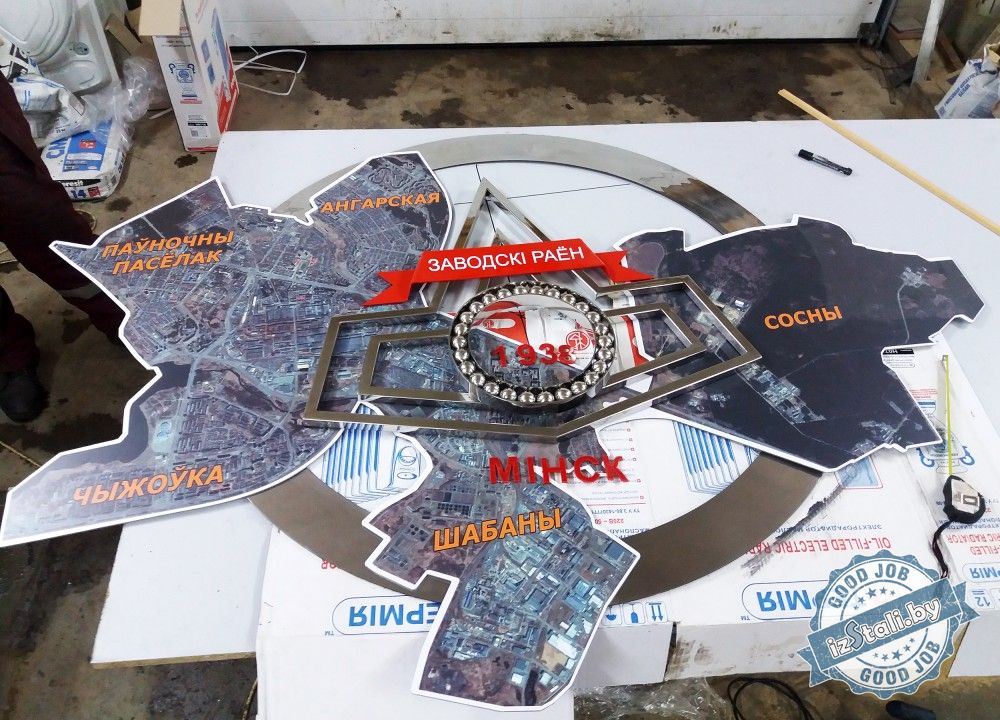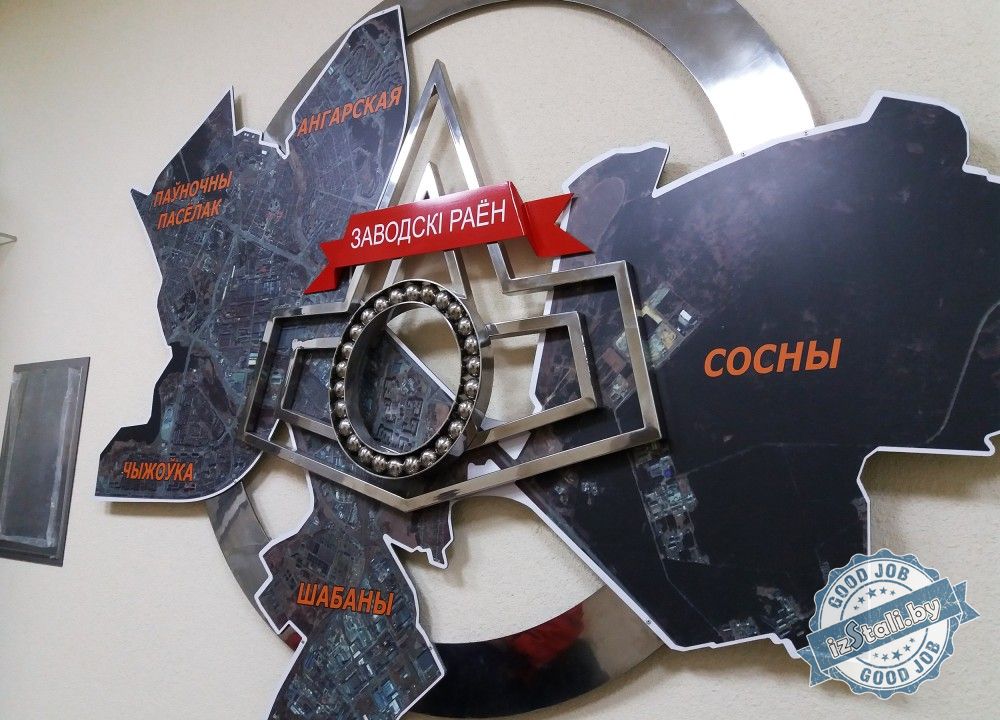 Герб Заводского района г.Минска совмещает в себе логотипы основных районообразующих гигантов индустрии: Минского автомобильного завода и подшипникового завода.Он изготовлен объемно из нержавеющей стали отполированной до зеркального блеска. Остальные элементы выполнены из пластмассы с лазерной резкой.