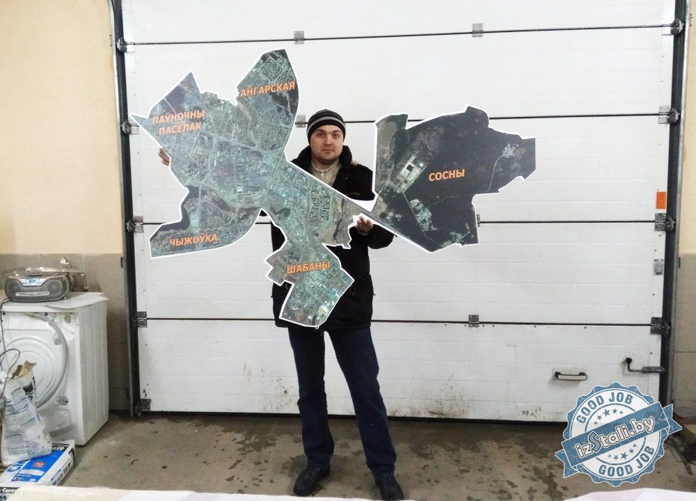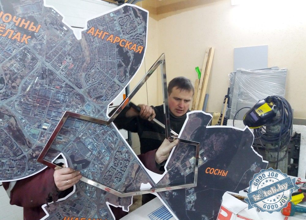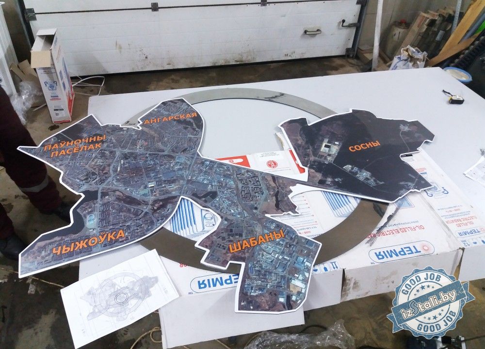 Карта района нанесена на жесткую композитную панель и закреплена на диск из нержавеющей стали.