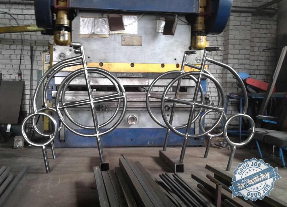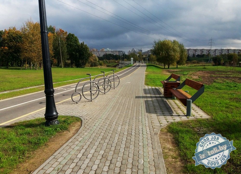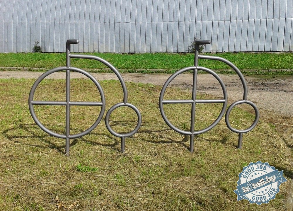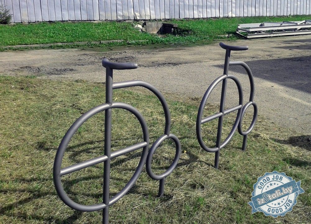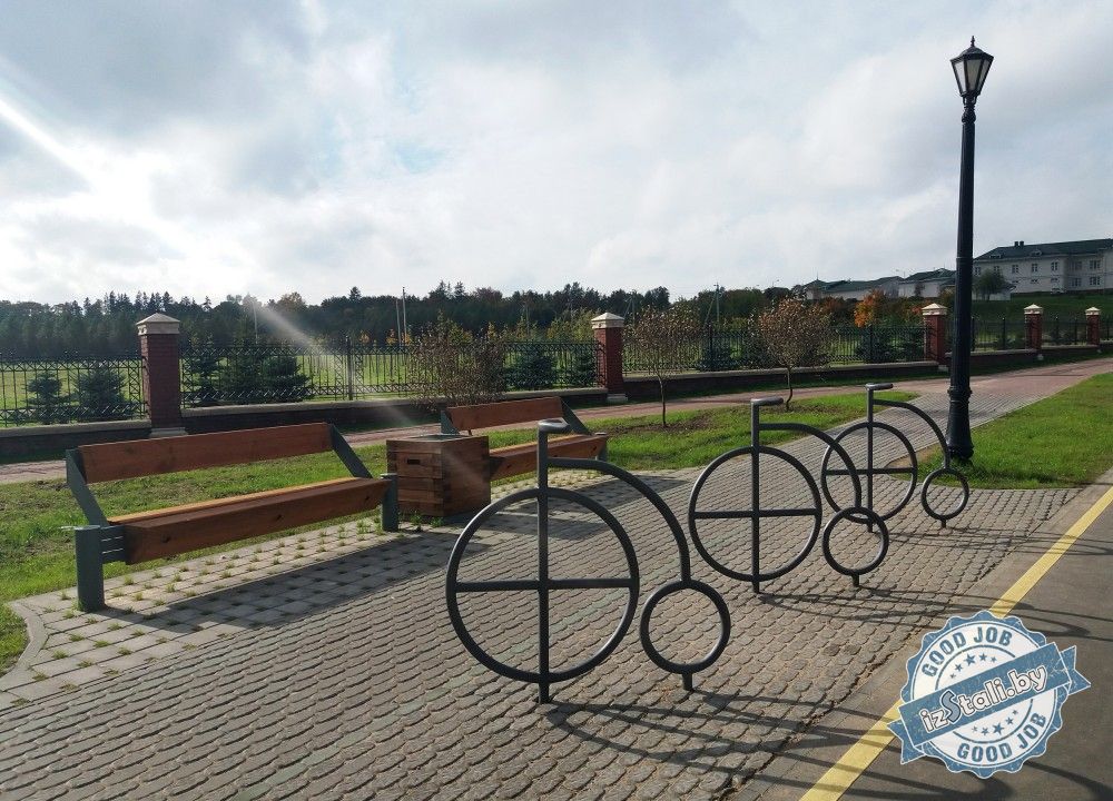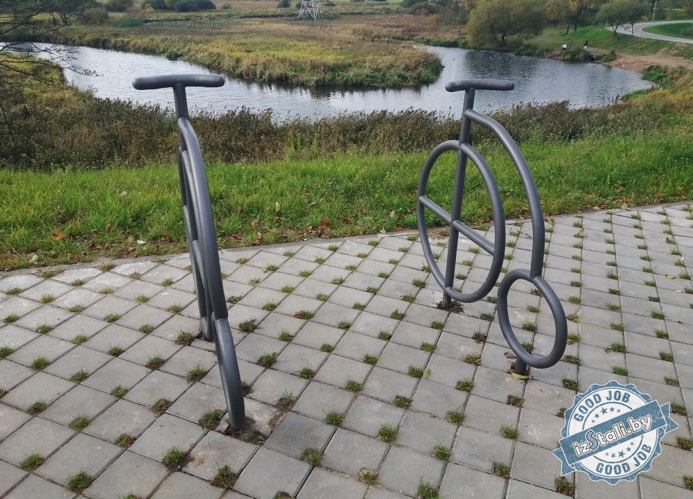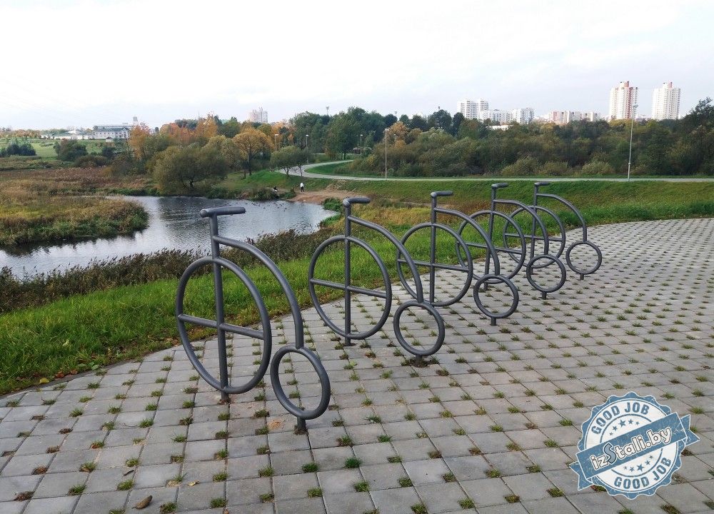 Один из хороших вариантов для велопарковки — конструкция в виде велосипеда были установлены при проведении работ по строительству новой велодорожки, которая связала Серебрянку с Лошицким парком. Такая велопарковка легко монтируется и отлично вписывается в уличное окружение. У одной такой стойки можно припарковать два велосипеда. Форма стойки позволяет зафиксировать велосипед замками в двух местах и использовать надёжные U-образные замки.