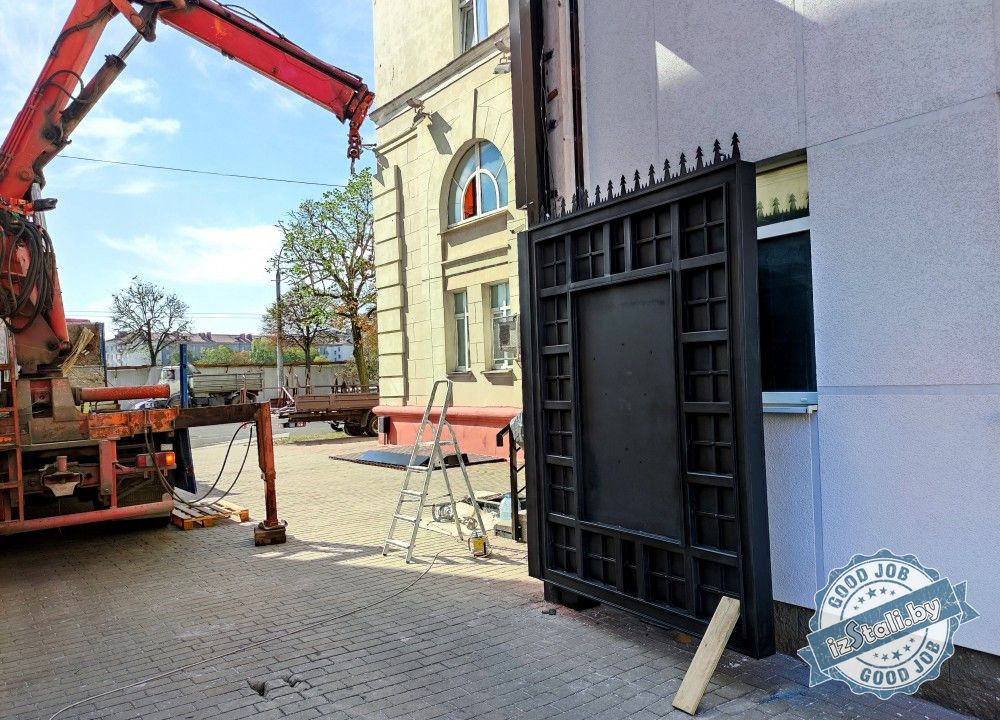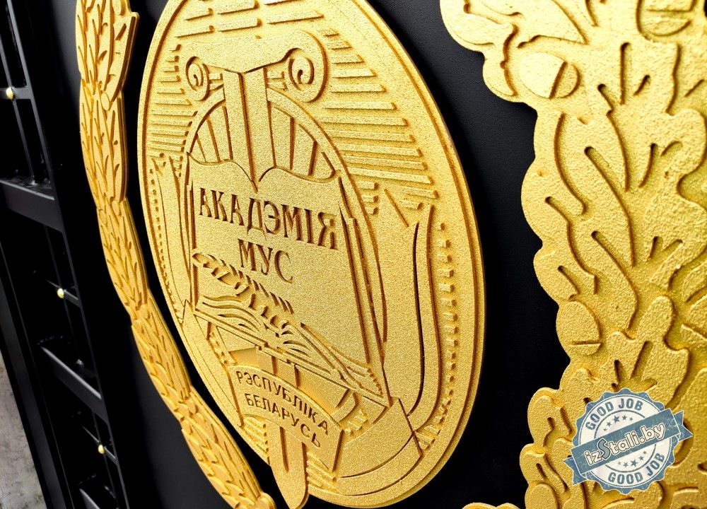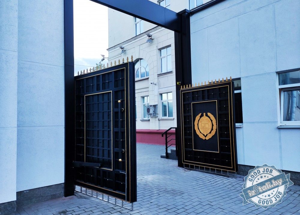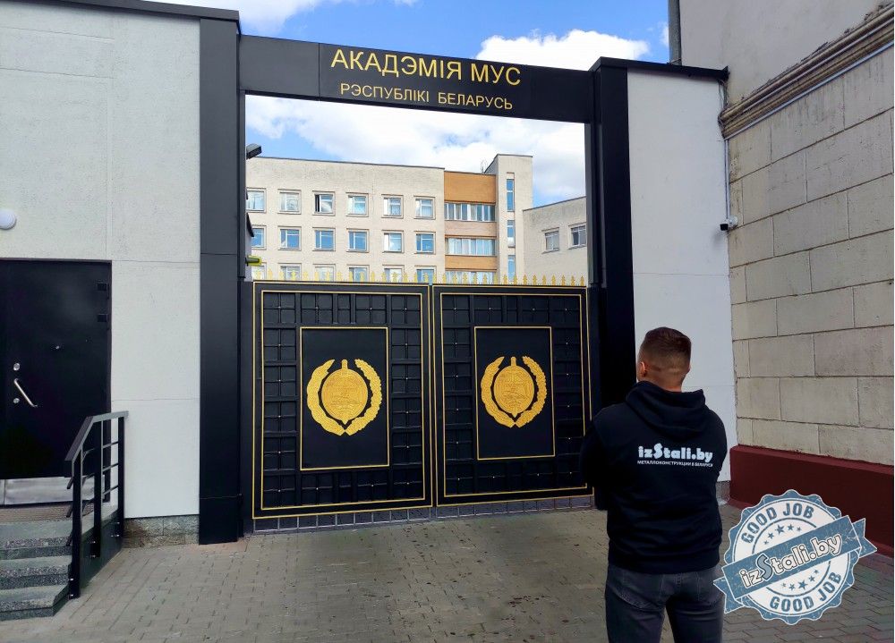 В процессе ремонта въездные ворота подверглись пескоструйной обработке с последующей окраской цинконаполненным грунтом и эмалями. Портал был отделан панелями из оцинкованной стали в полимерной окраске черного цвета. Вся конструкция была дополнена декоративными элементами с окраской в цвет янтарного золота. Объемные гербы учереждения образования выполнены из нержавеющей стали.