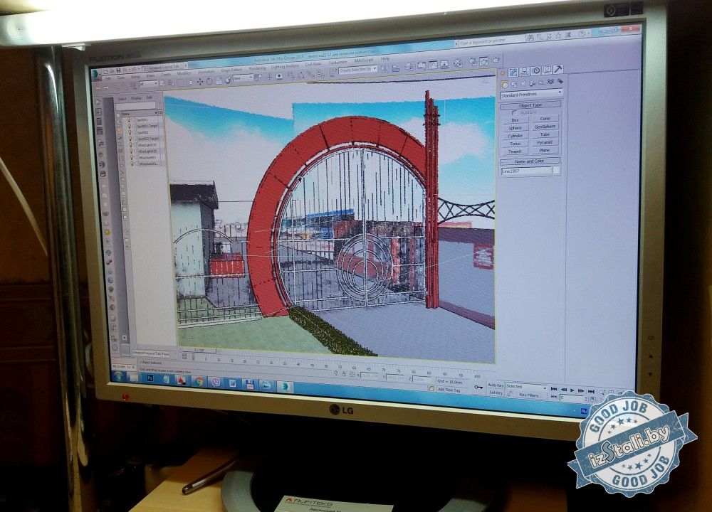 Конструкция представляет собой массивную металлическую арку, которая опирается на стеллу. В арку установлены створки ворот.