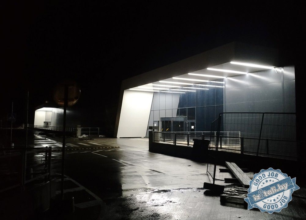 В местах стыковки панелей на потолке установлены линейные светодиодные светильники, которые в темное время суток делают входные группы яркими и заметными.
