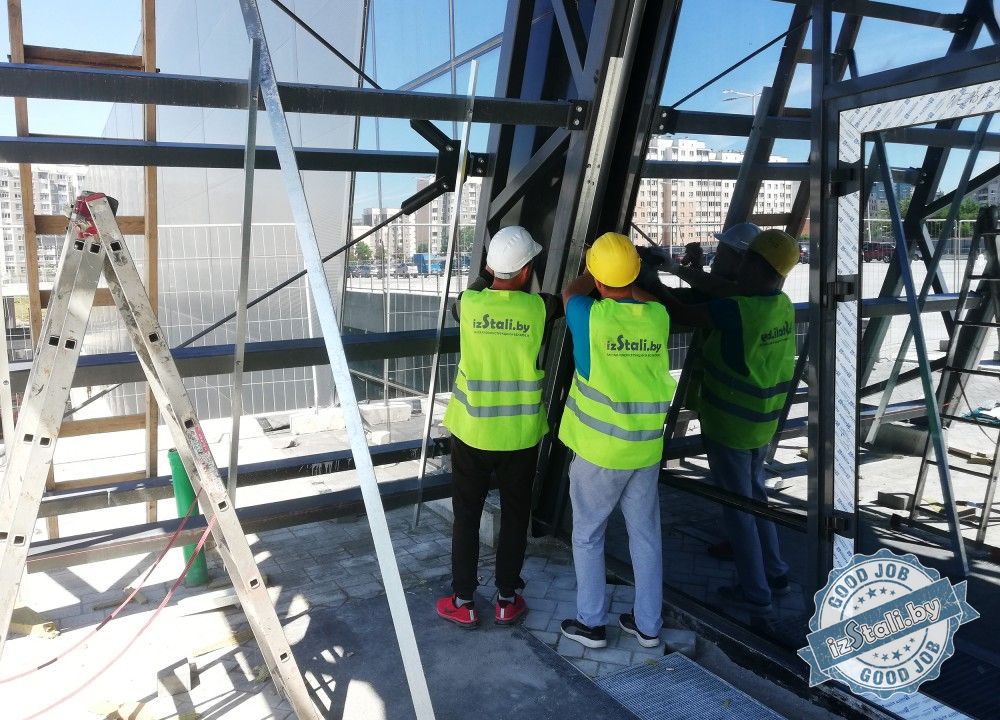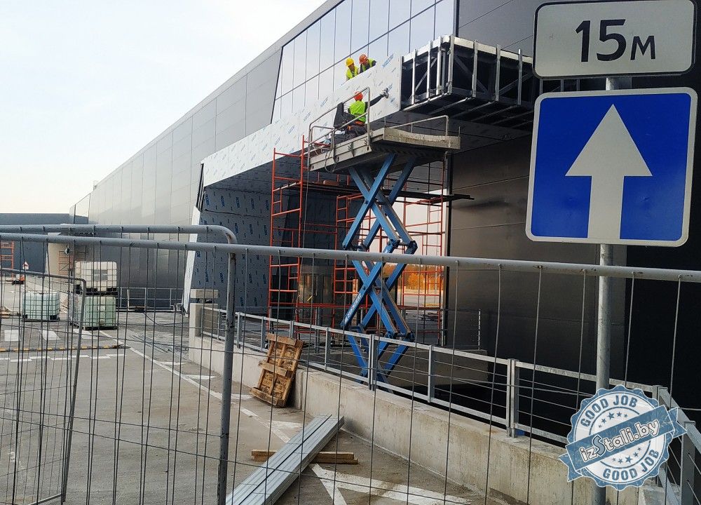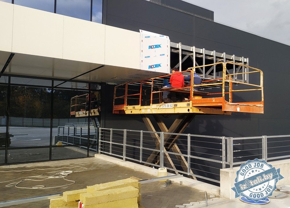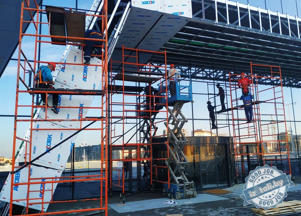 На прочный стальной металлокаркас установлена подсистема из оцинкованной стали. Данная подсистема служит основой для широкоформатных алюминиевых композитных панелей AlcoteK. Данные панели хорошо зарекомендовали себя при устройстве вентилируемых фасадов здания. Они превосходно выдерживают ветровые и атмосферные воздействия, долговечны, надежны, практичны.