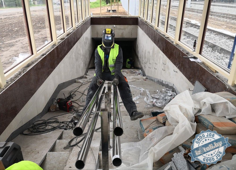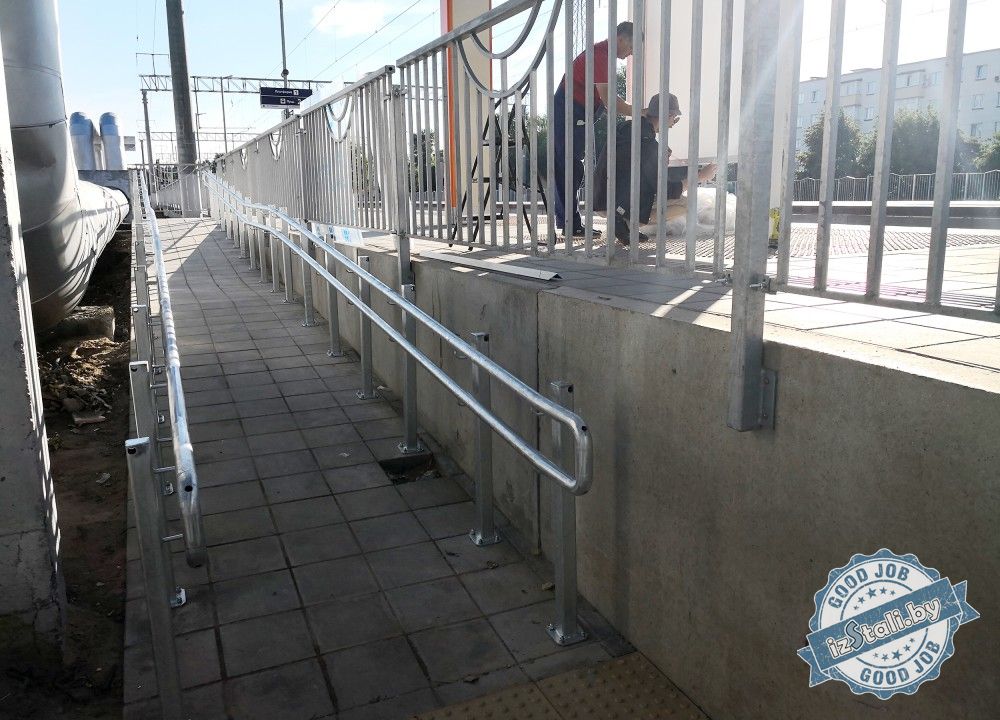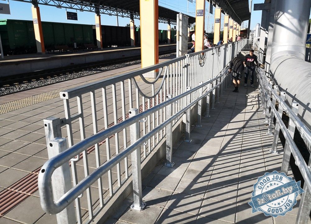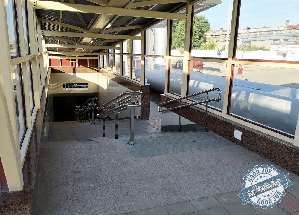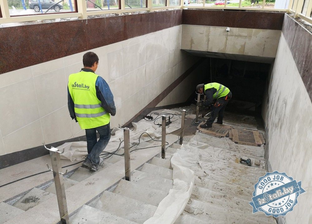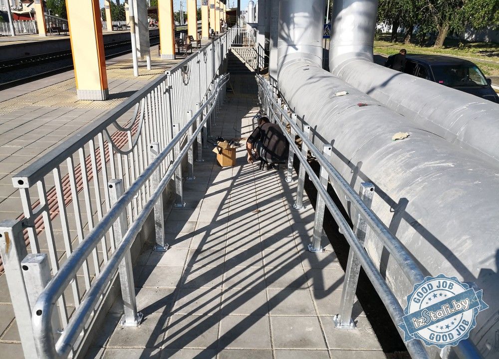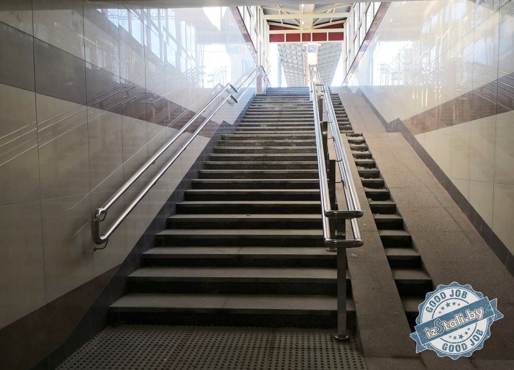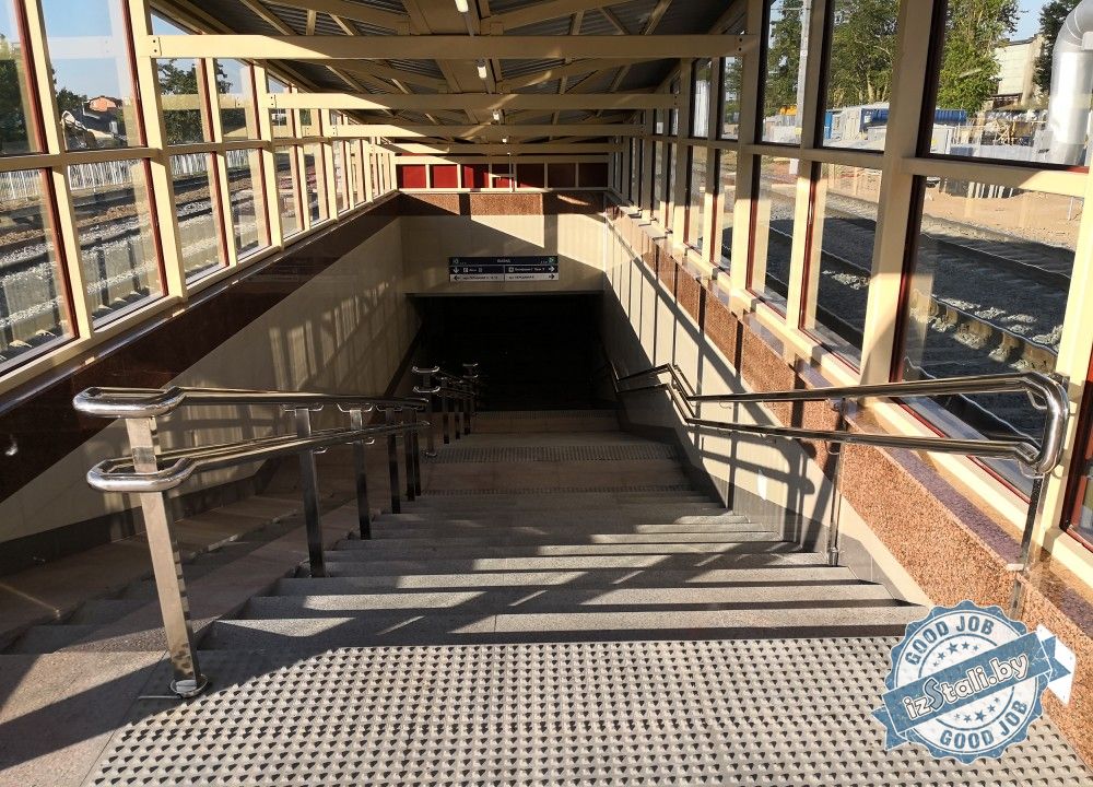 Спуски в подземный переход оборудованы перилами и поручнями из нержавеющей стали. Уличные металлоконструкции и ограждения выполненны с антикоррозийной защитой методом горячего цинкования. Применение коррозионностойкой стали гарантирует долговечную эксплуатацию установленных ограждений и конструкций без потери внешнего вида и прочностных характеристик.