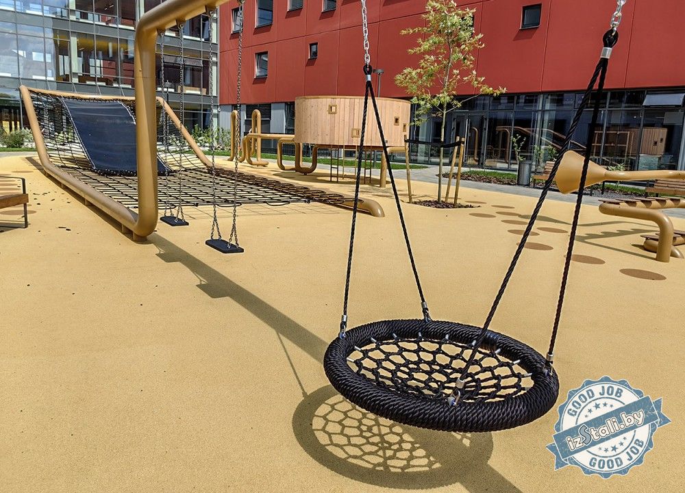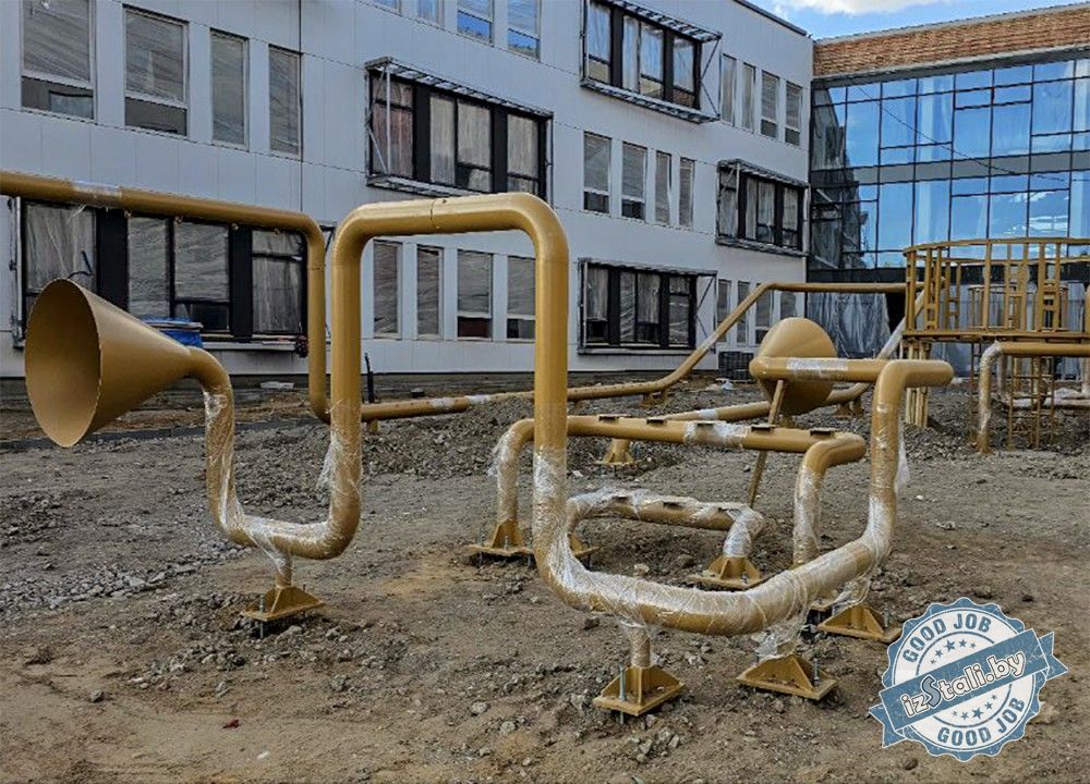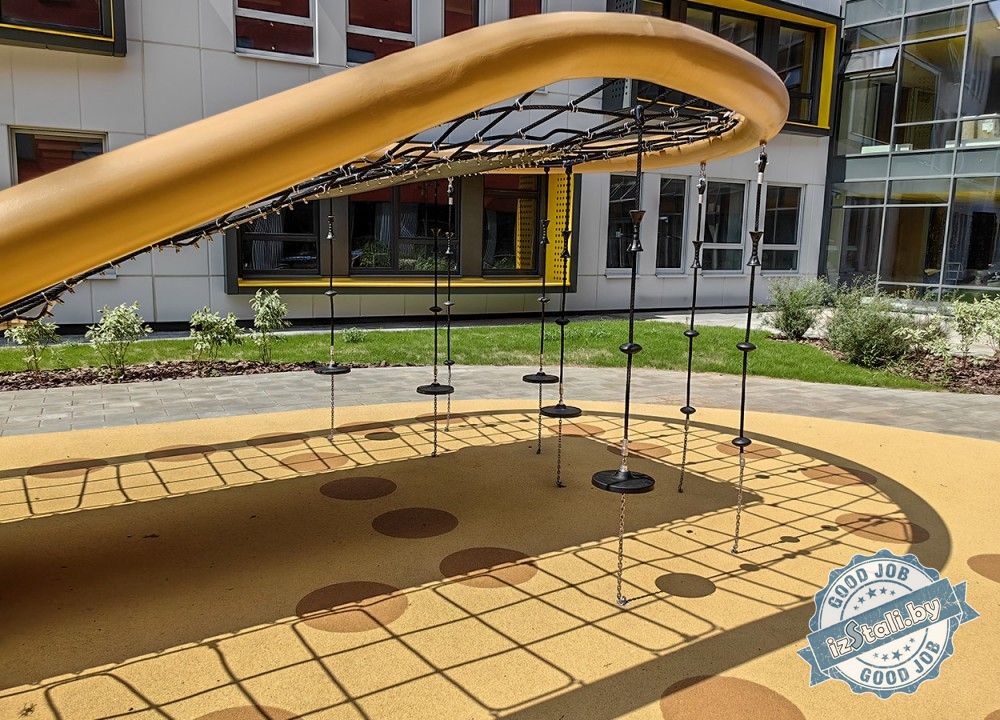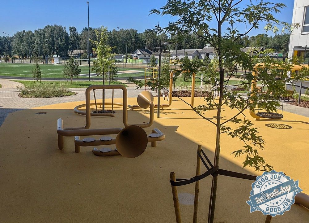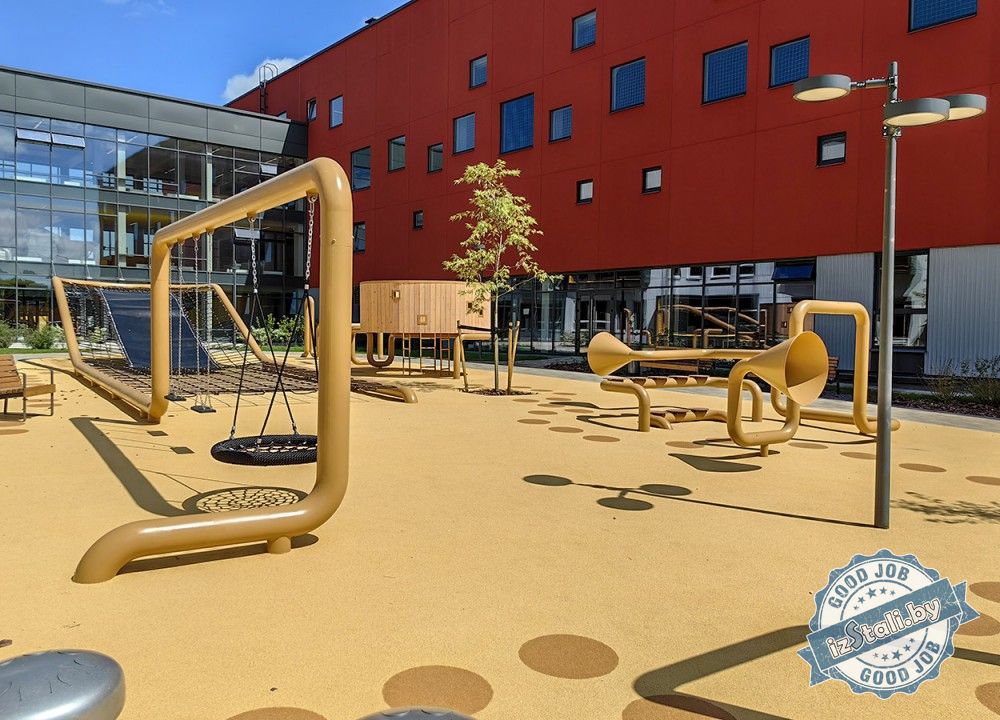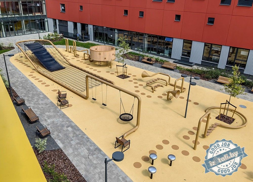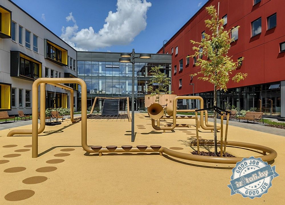 Центральный двор школы украсила необычная детская площадка, на которой будет царить атмосфера веселья и беззаботности. Разнообразные качели, раскачиваясь под легким ветерком, зовут детей к играм и смеху. Рядом установлены слуховые трубы, через которые можно шептать секреты друзьям на другом конце экпоната, создавая ощущение таинственности и приключений.