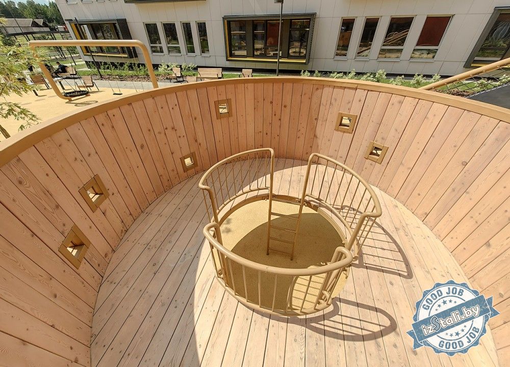 А на краю площадки возвышается уютный домик на высоте. Он словно корабль в облаках, где можно просто отдохнуть от шумных игр. С балкончика открывается прекрасный вид на всю площадку.