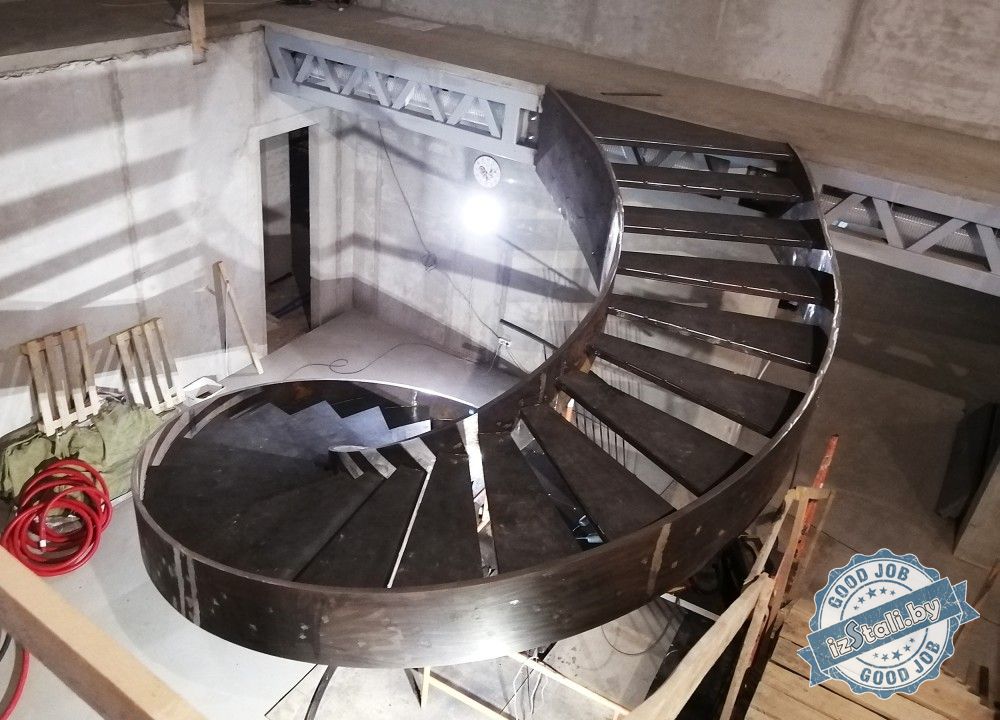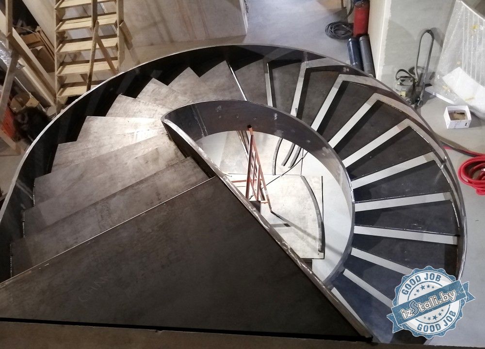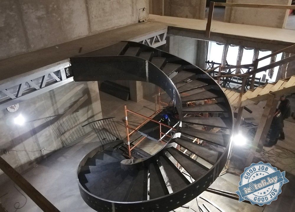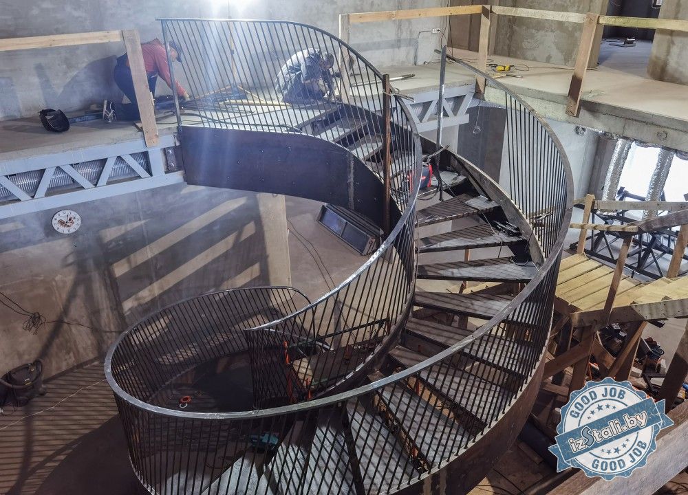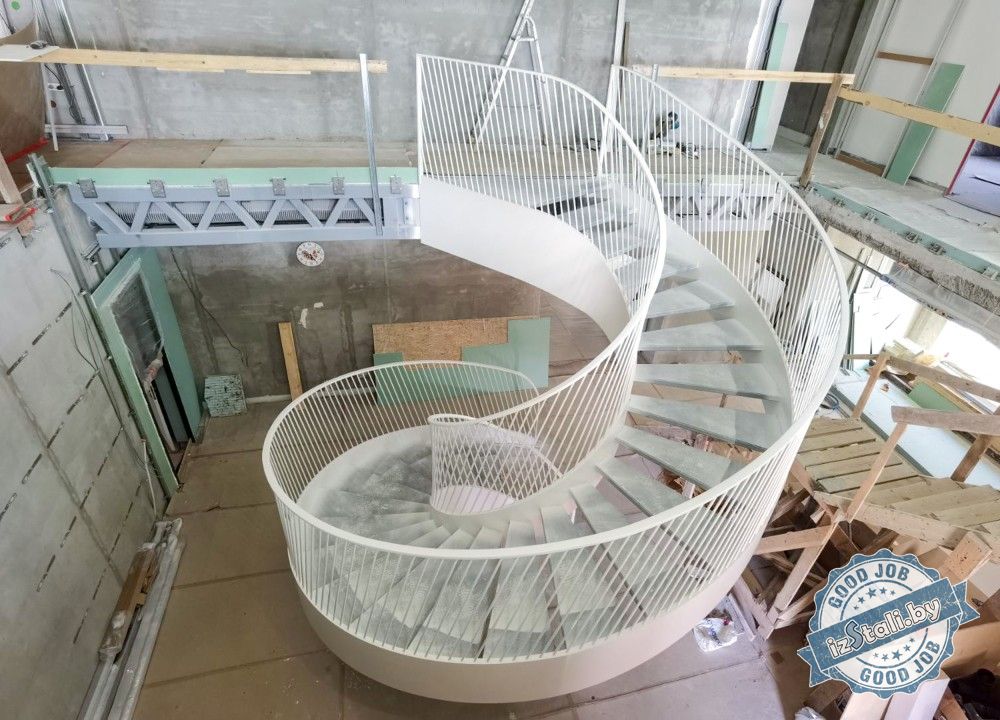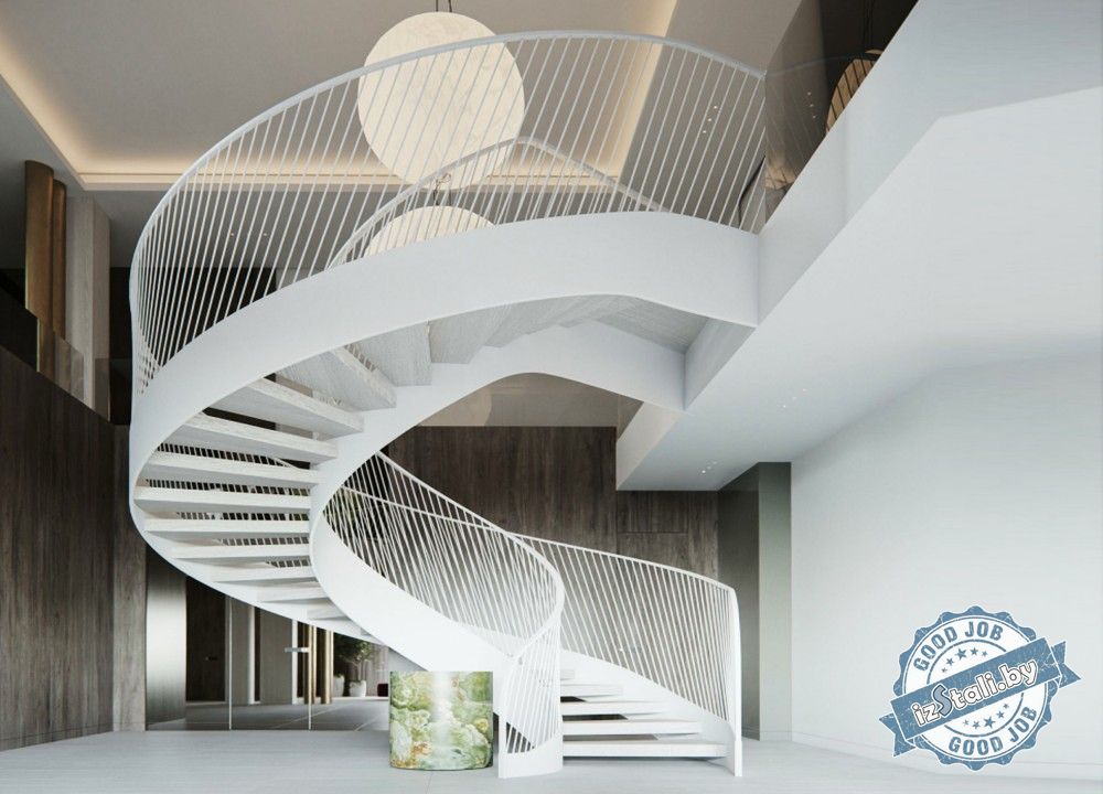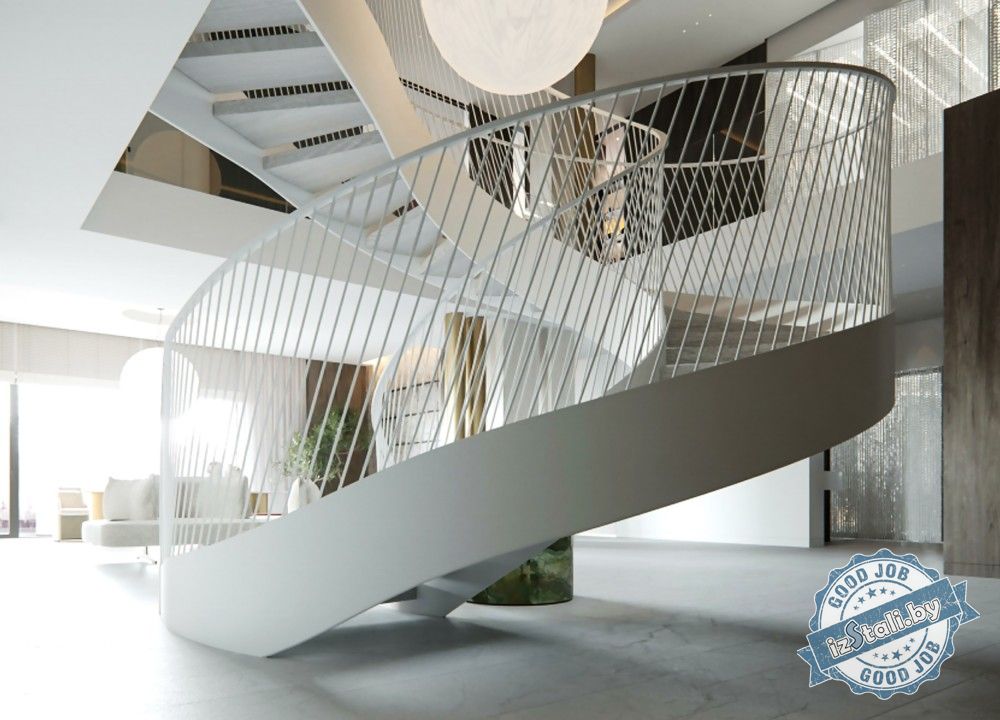 Необычная винтовая лестница из металла украсила огромный холл загородного дома. Наклоненные стойки ограждения создают головокружительный эффект и делают эту лестницу ярким элементом в дизайне помещения. Прочные стальные косоуры связанные между собой ступенями обеспечивают жесткость и прочность конструкции. Хождение по такой лестнице безопасно и очень комфортно.
