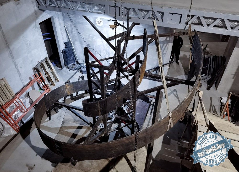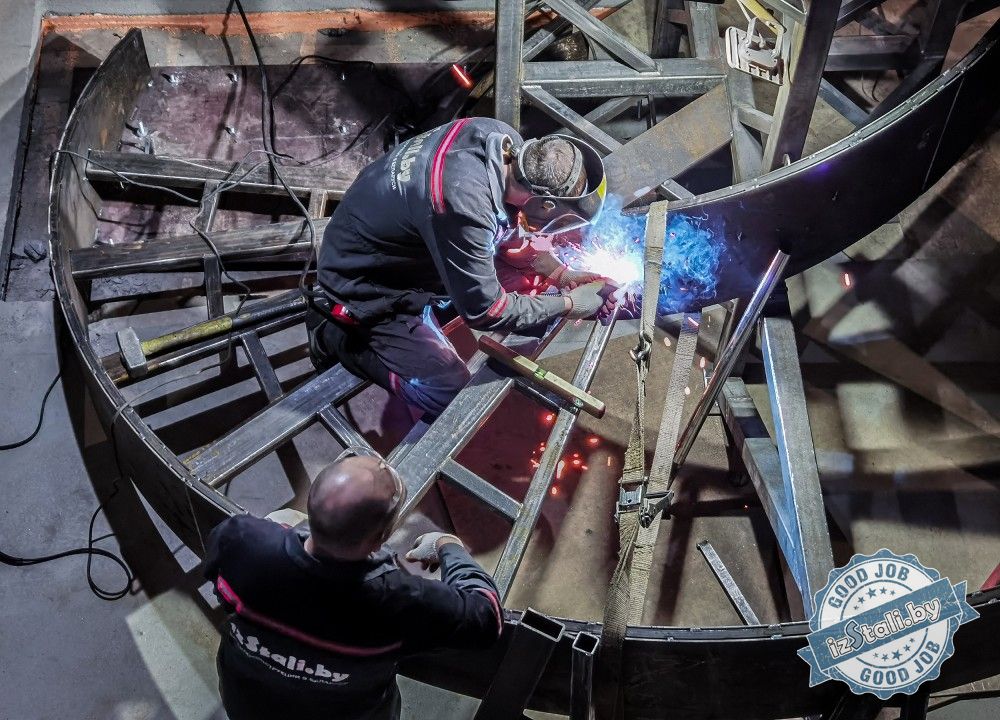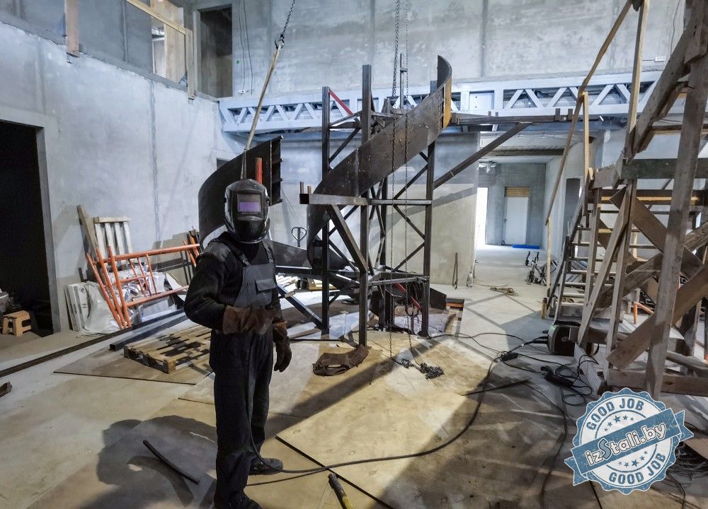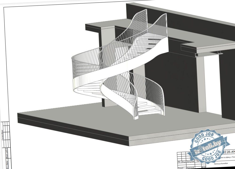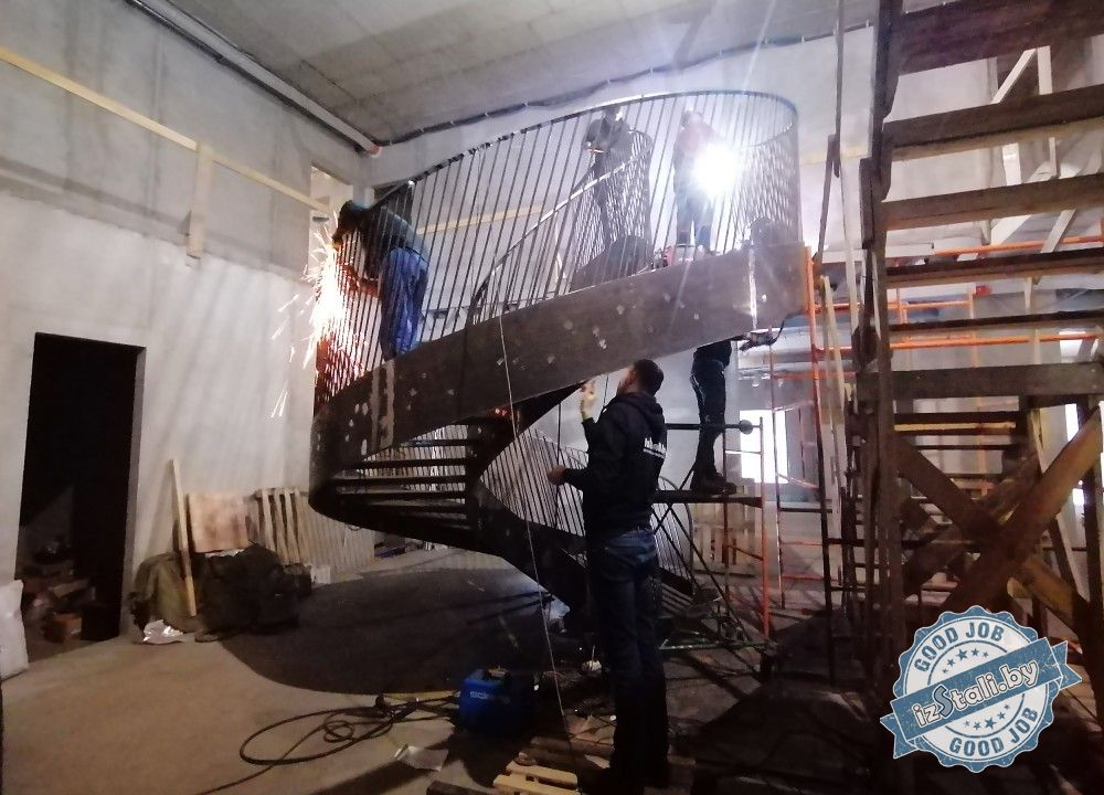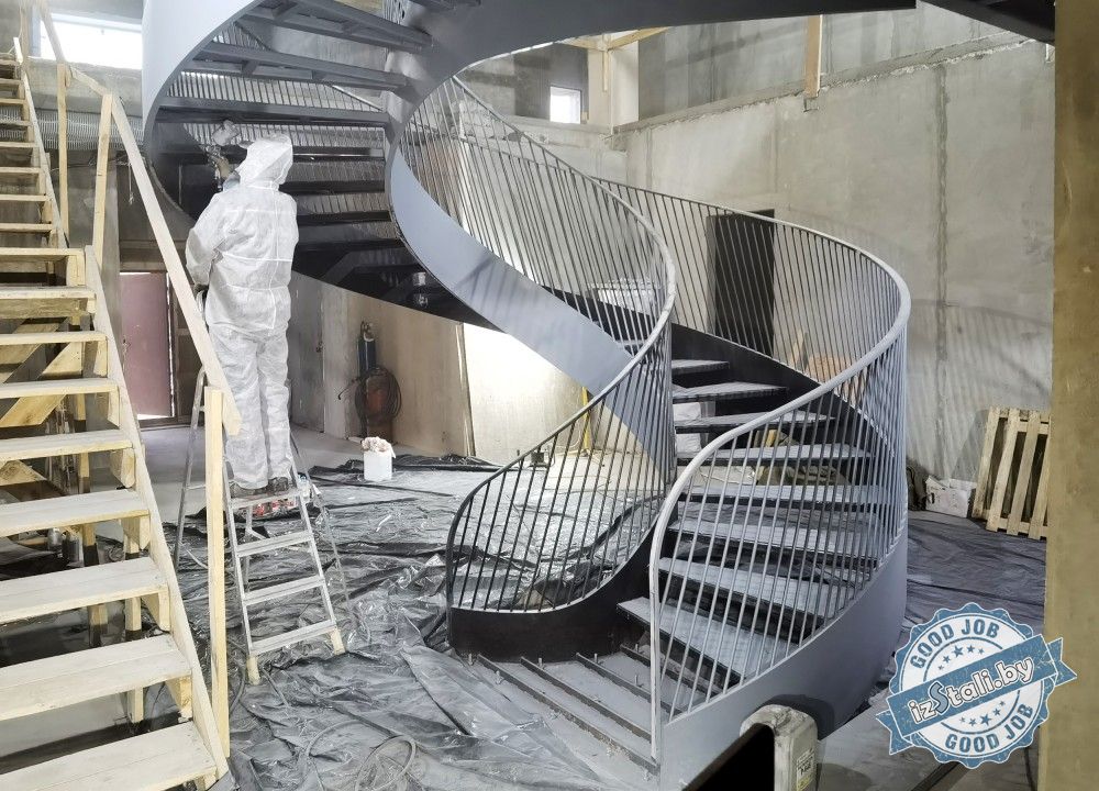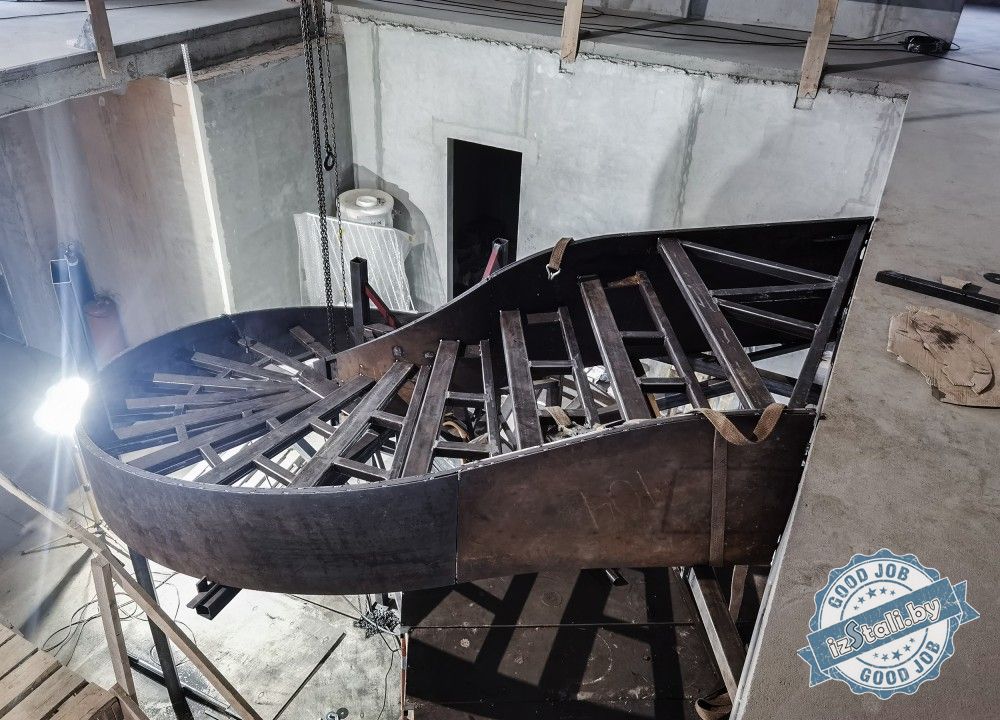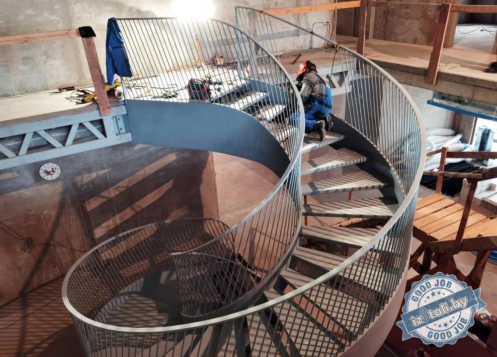 Необычная винтовая лестница из металла украсила огромный холл загородного дома. Наклоненные стойки ограждения создают головокружительный эффект и делают эту лестницу ярким элементом в дизайне помещения. Прочные стальные косоуры связанные между собой ступенями обеспечивают жесткость и прочность конструкции. Хождение по такой лестнице безопасно и очень комфортно.