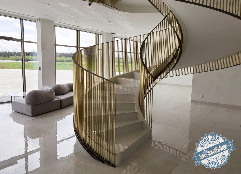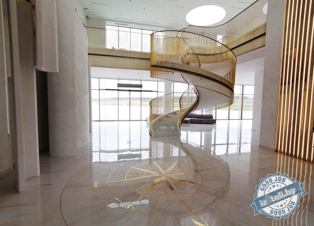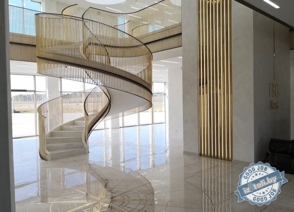 Одним из ярких элементов парадного зала в центре бизнес авиации стала винтовая лестница с латунными ограждениями.