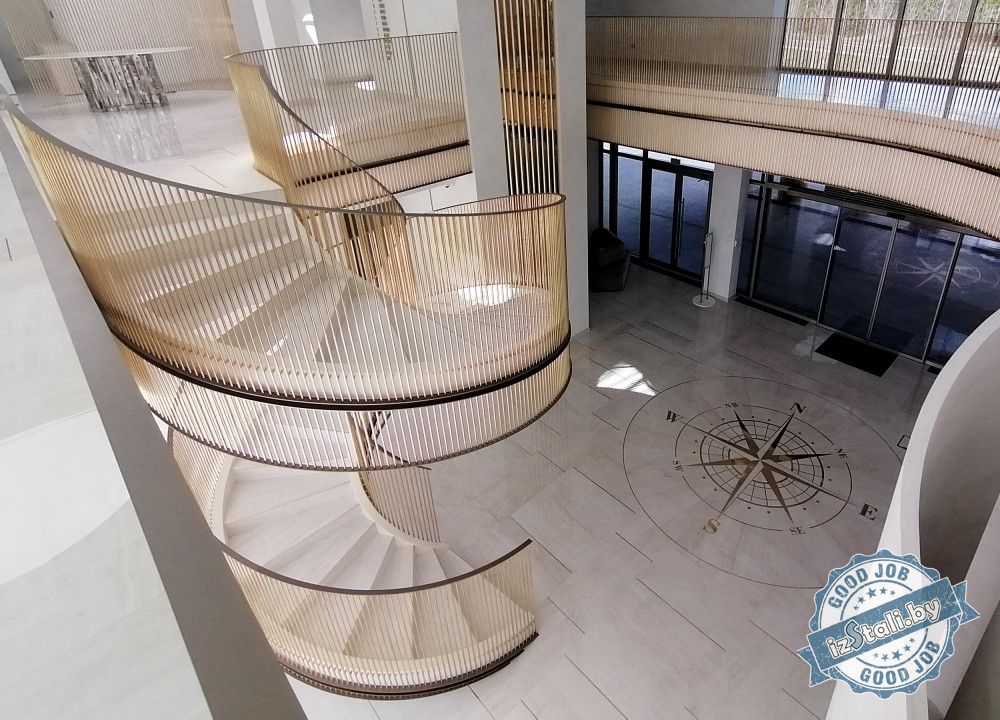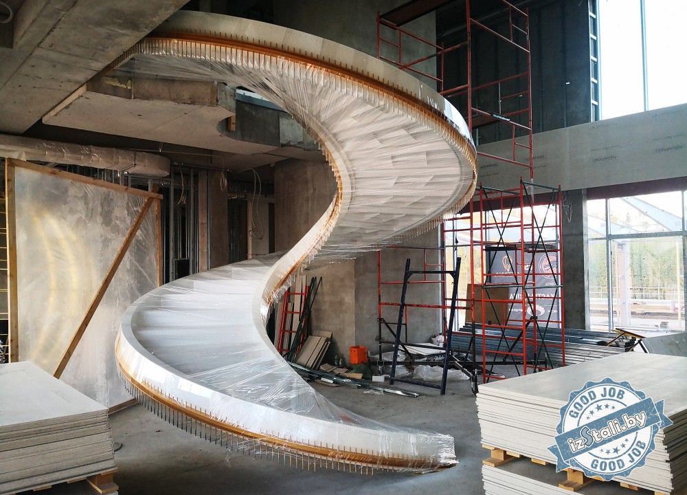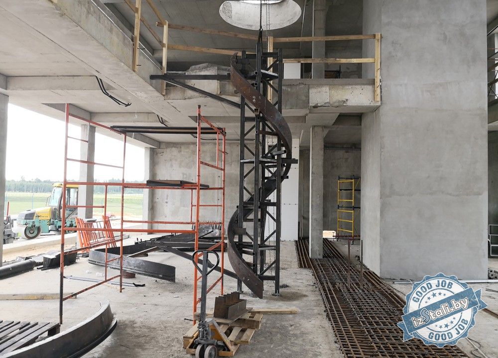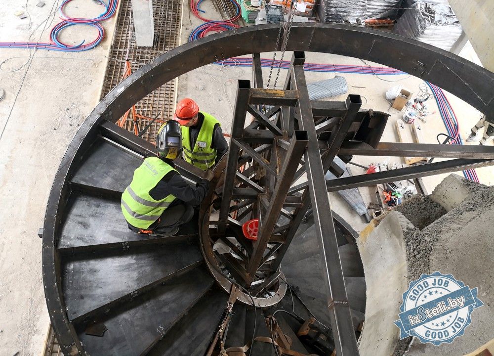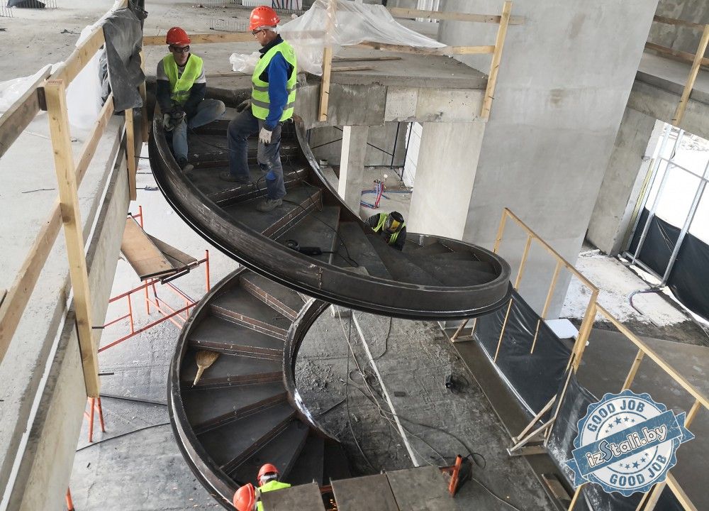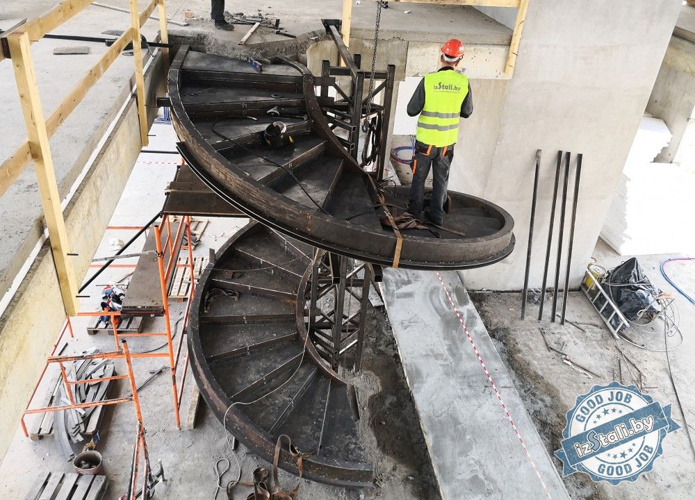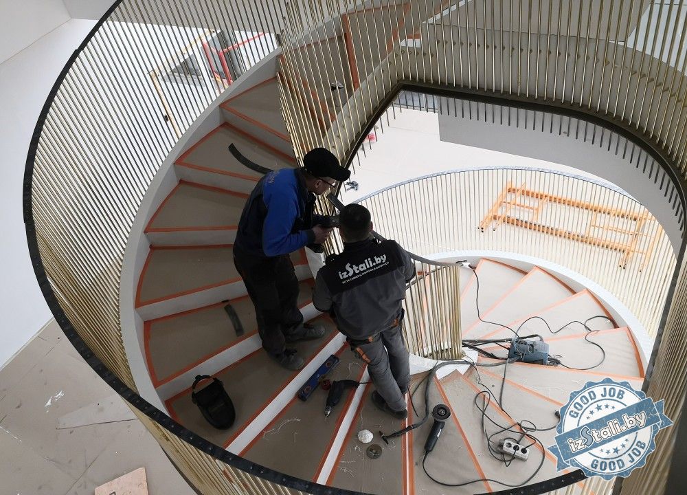 Основным несущим элементом винтовой лестницы является объемный сварной косоур коробчатого сечения из листовой стали. Косоуры жестко установлены на фундаментные и закладные опоры и связаны между собой стальными ступенями и подступенками. Высокая жесткость основы позволила облицевать ступени и подступенки камнем.