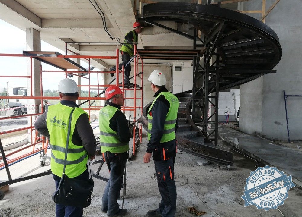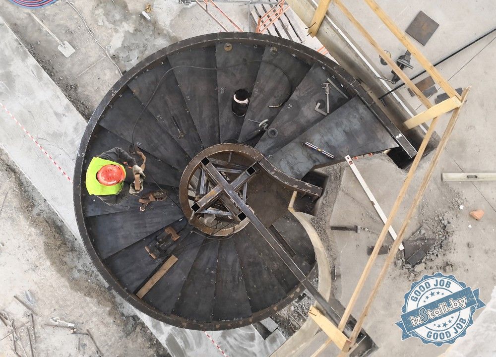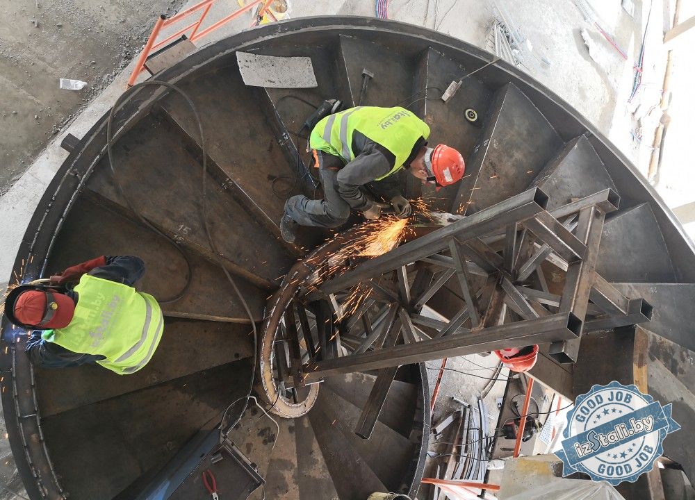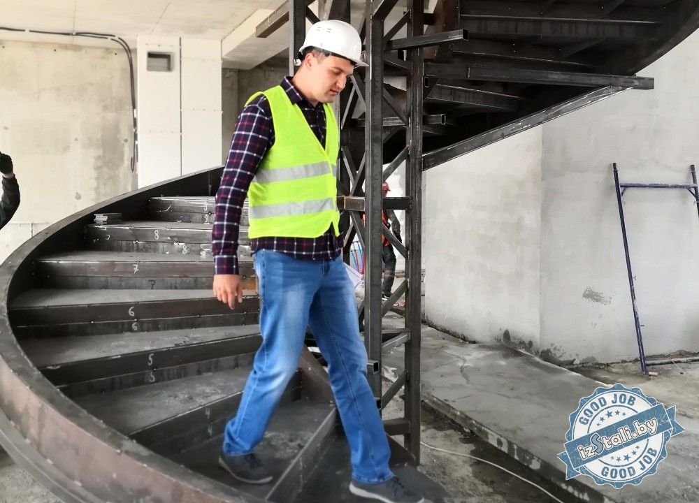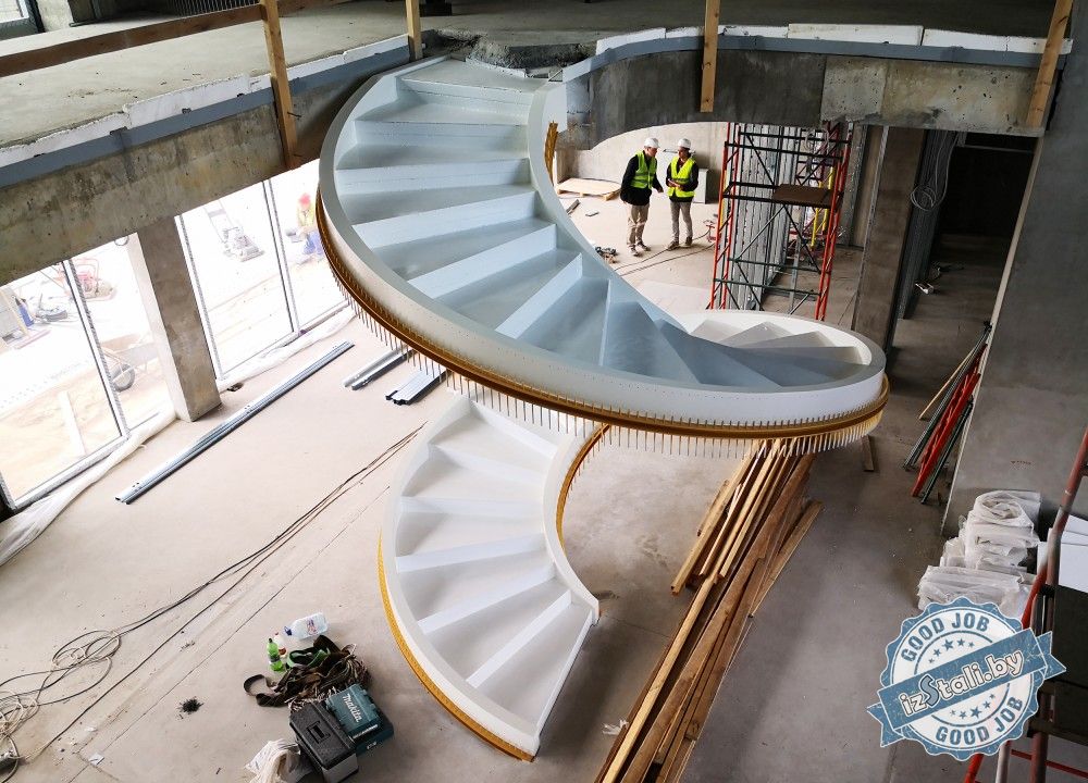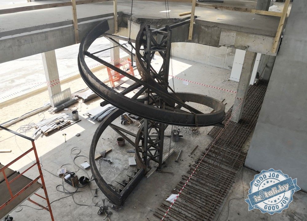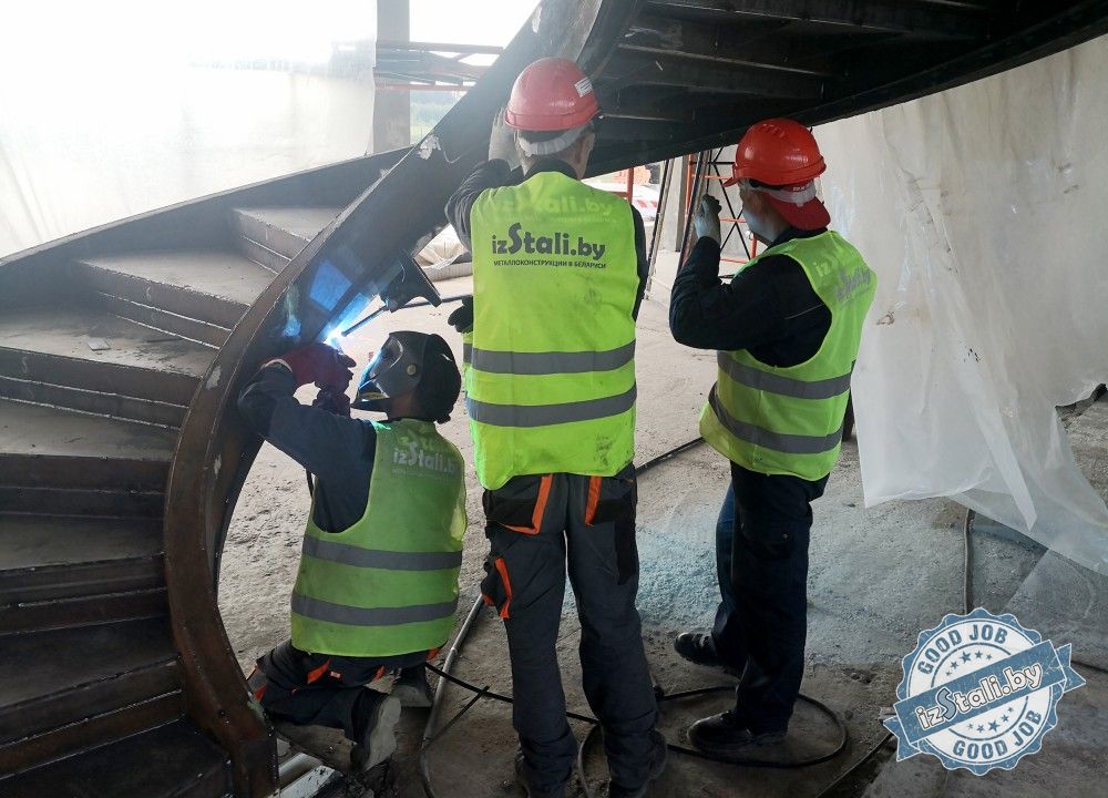 Основным несущим элементом винтовой лестницы является объемный сварной косоур коробчатого сечения из листовой стали. Косоуры жестко установлены на фундаментные и закладные опоры и связаны между собой стальными ступенями и подступенками. Высокая жесткость основы позволила облицевать ступени и подступенки камнем.