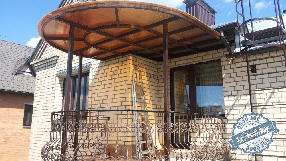 Металлический навес с покрытием поликарбонатом полностью решил проблему замокания на балконе, обеспечил защиту не только от снега и дождя, но и от палящего солнца. С таким козырьком над балконом стало комфортнее отдыхать. На балкон с крышей теперь можно поставить удобную мебель, позволяющую проводить время на балконе. Отсутствие прямого солнца жарким летом, защита от пыли, снега и дождевой воды улучшили атмосферу не только на балконе, но и в доме. Конструкция навеса имеет несколько металлических опор связанных с балконным ограждением, благодаря чему существующий поручень приобрел дополнительную жесткость.