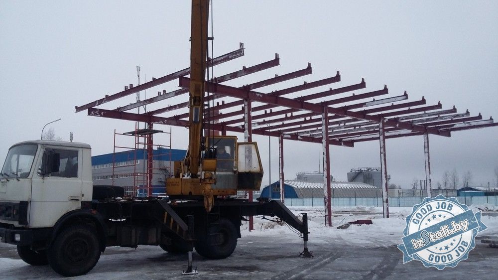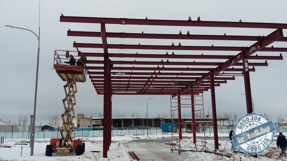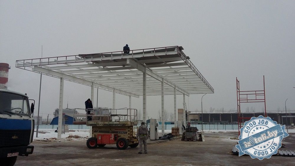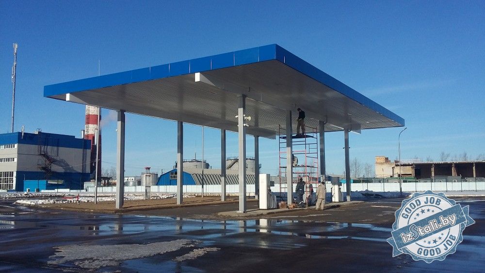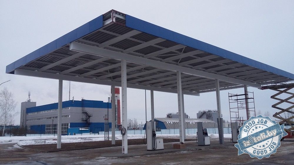 Навес над топливо-раздаточными колонками автозаправочной станции национального аэропорта "Минск" представляет собой несущий стальной металлокаркас установленный на бетонные тумбы (фундаменты). Покрытие навеса выполнено оцинкованным профлистов в полимерном покрытии. Колонны и парапет отделаны декоративными кассетами из оцинкованной стили в полимерном покрытии.