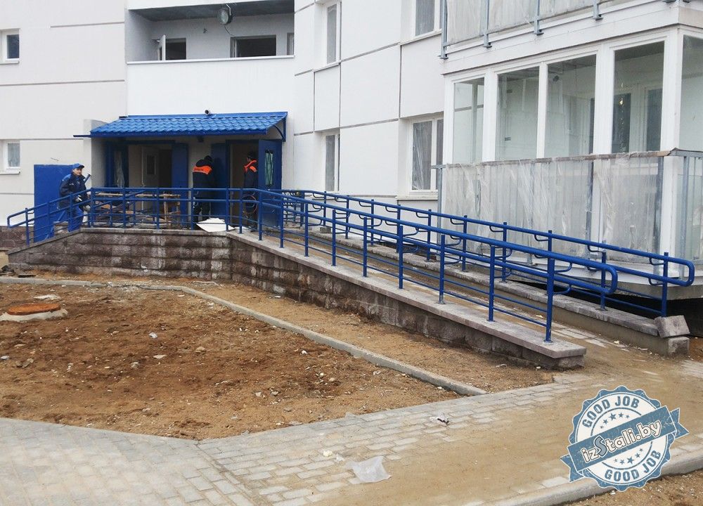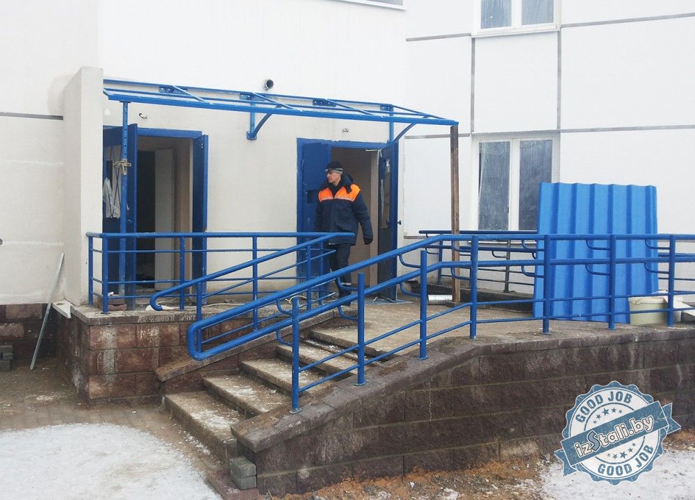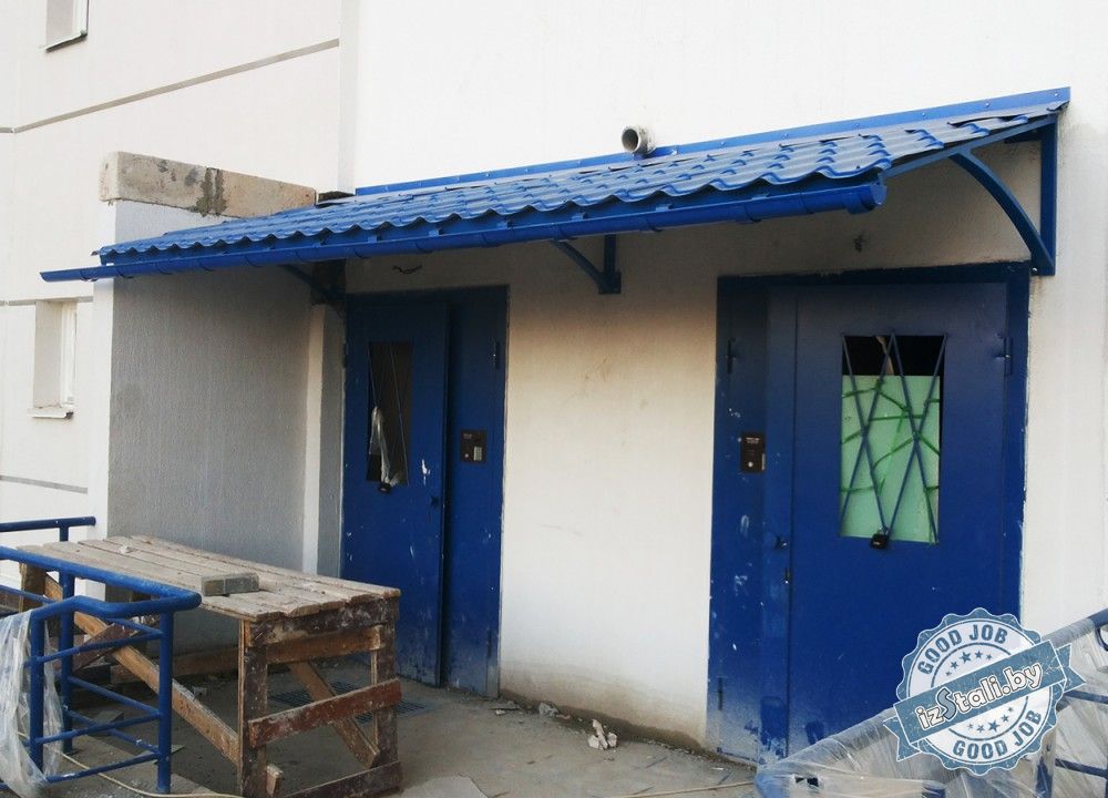 Козырек перед входом в жилой дом выполнен из окрашеной стали с покрытием металлочерепицей. Такой козырек распологается под балконнами и защищает проходящих людей не только от осадков, но и от падения с высоты различных предметов.