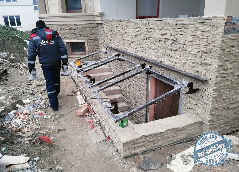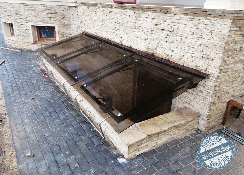 При устройстве спуска в подвал с улицы возникает вопрос: Как красиво и компактно защитить построенный приямок от осадков?