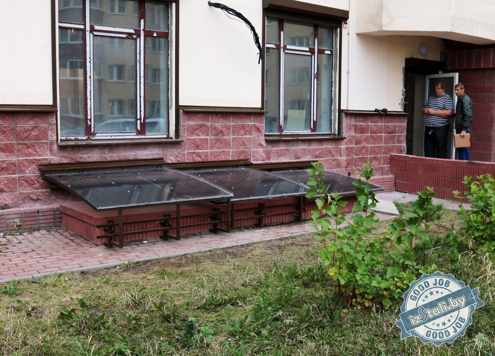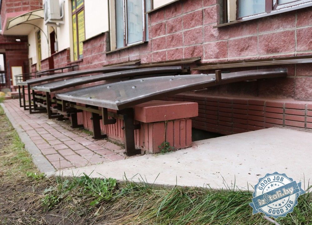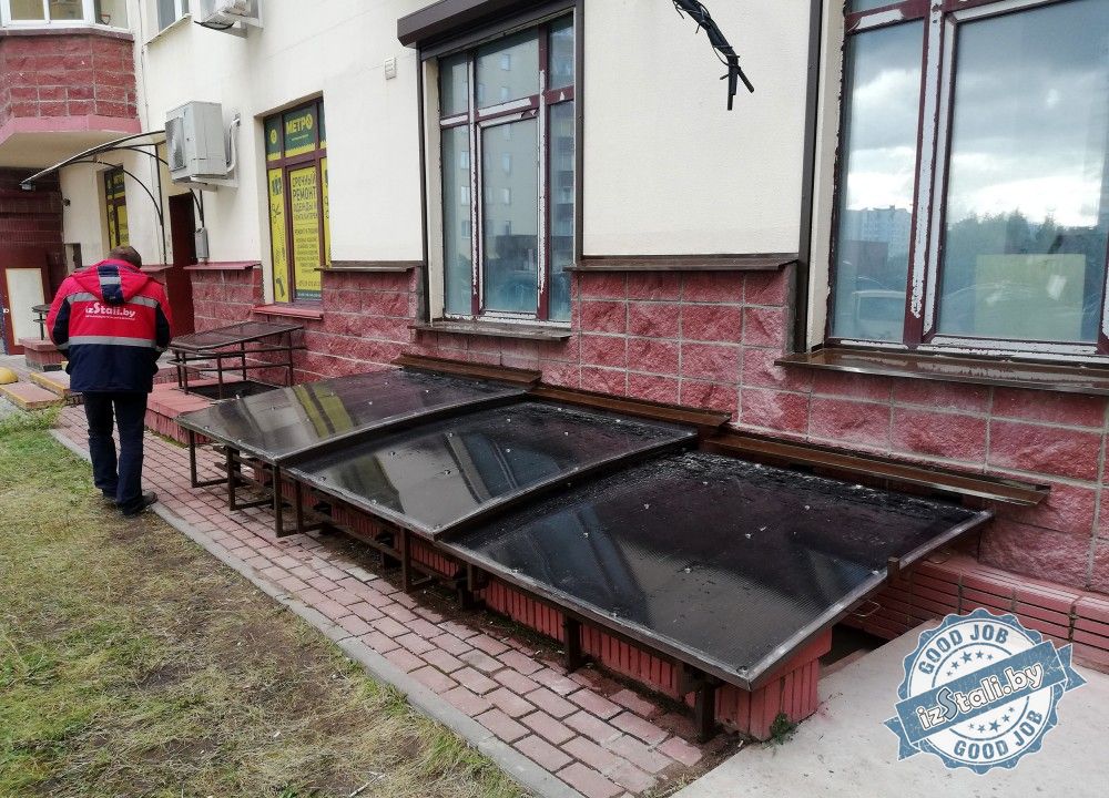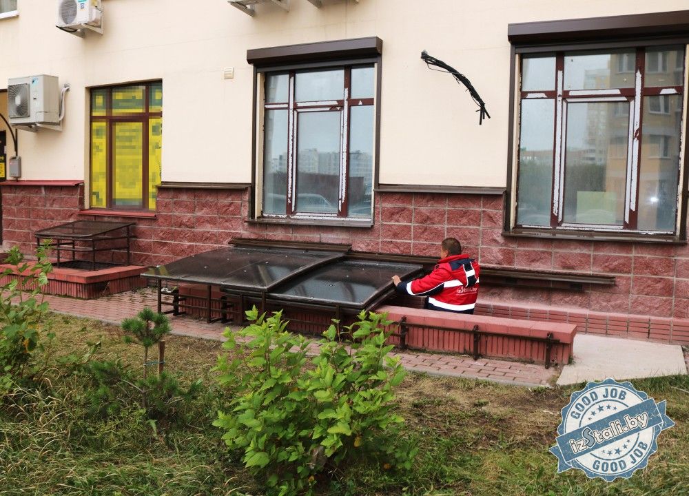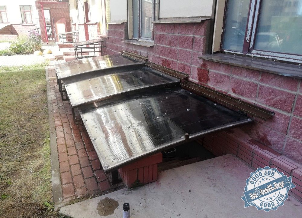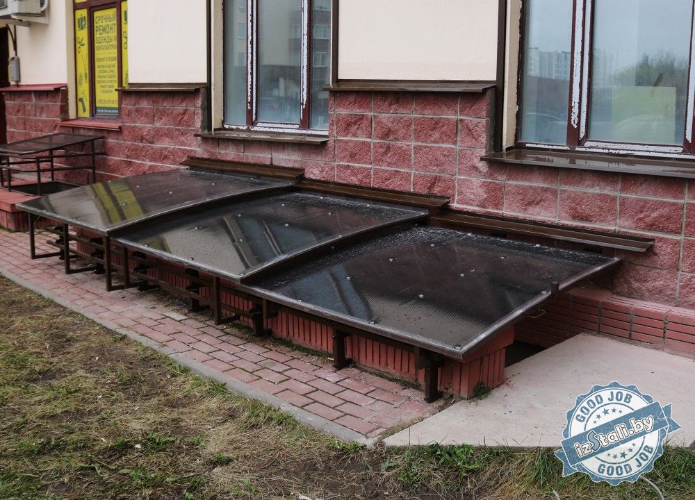 Навес откатной на роликовых направляющих отличное компактное решение для защиты спуска в подвал от осадков, когда выше приямка находятся окна/коммуникации или просто требуется красивая негабаритная конструкция.