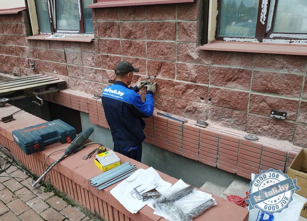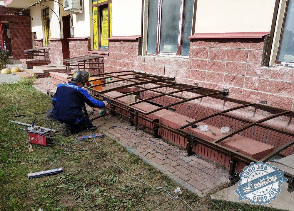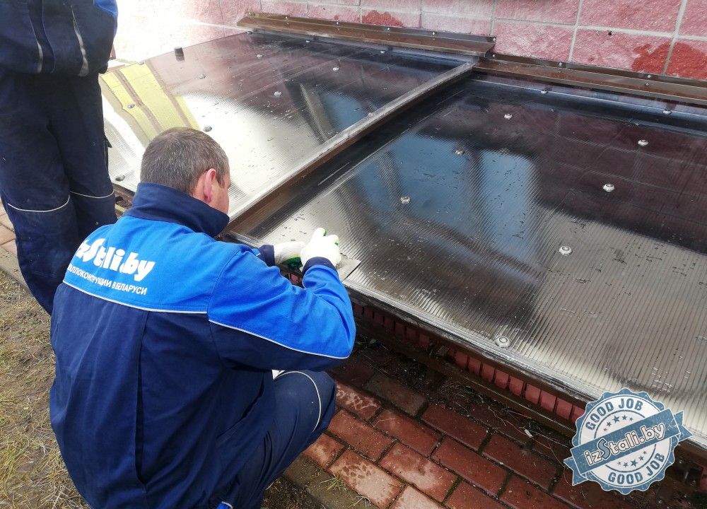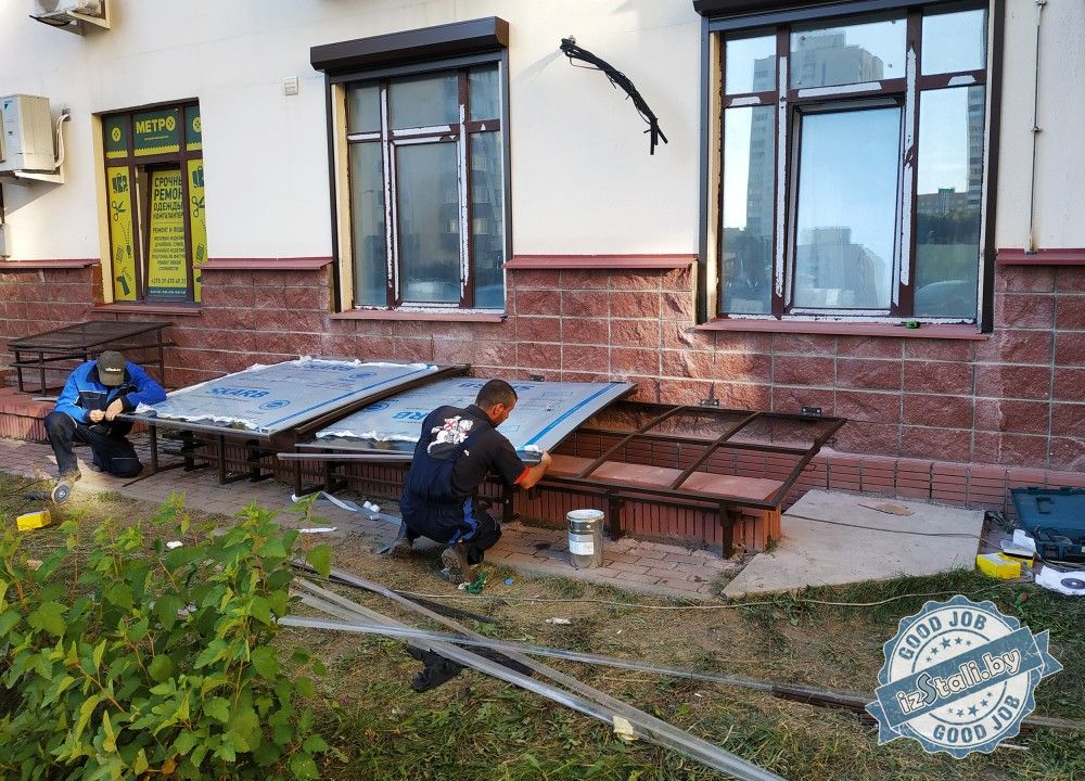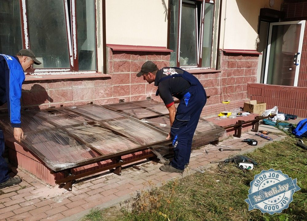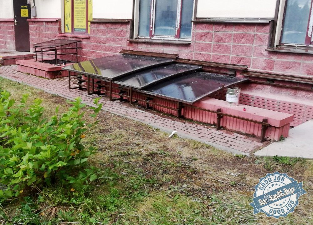 Навес откатной на роликовых направляющих отличное компактное решение для защиты спуска в подвал от осадков, когда выше приямка находятся окна/коммуникации или просто требуется красивая негабаритная конструкция.