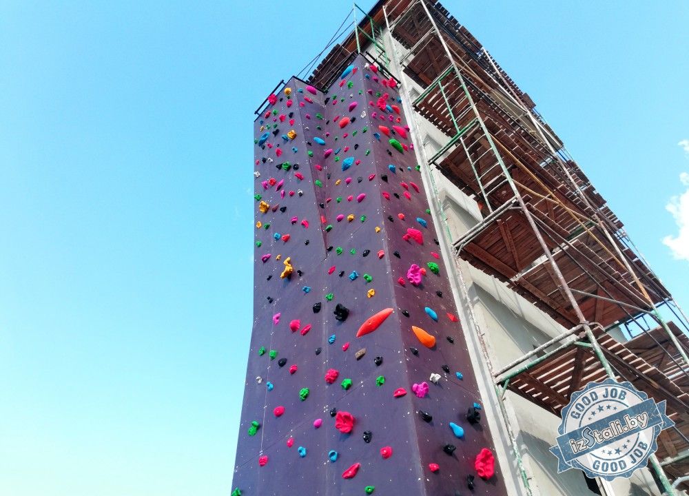 Прочный объемный стальной металлокаркас с наклонными плоскостями облицован рельефными скалолазными панелями с множеством маршрутов. На протяжении маршрутов и в верхней части скалодрома предусмотрены точки страховки, которые обеспечивают безопасность при тренировках спасателей.