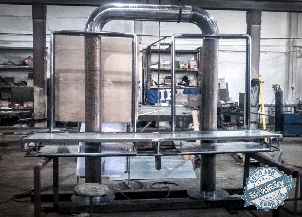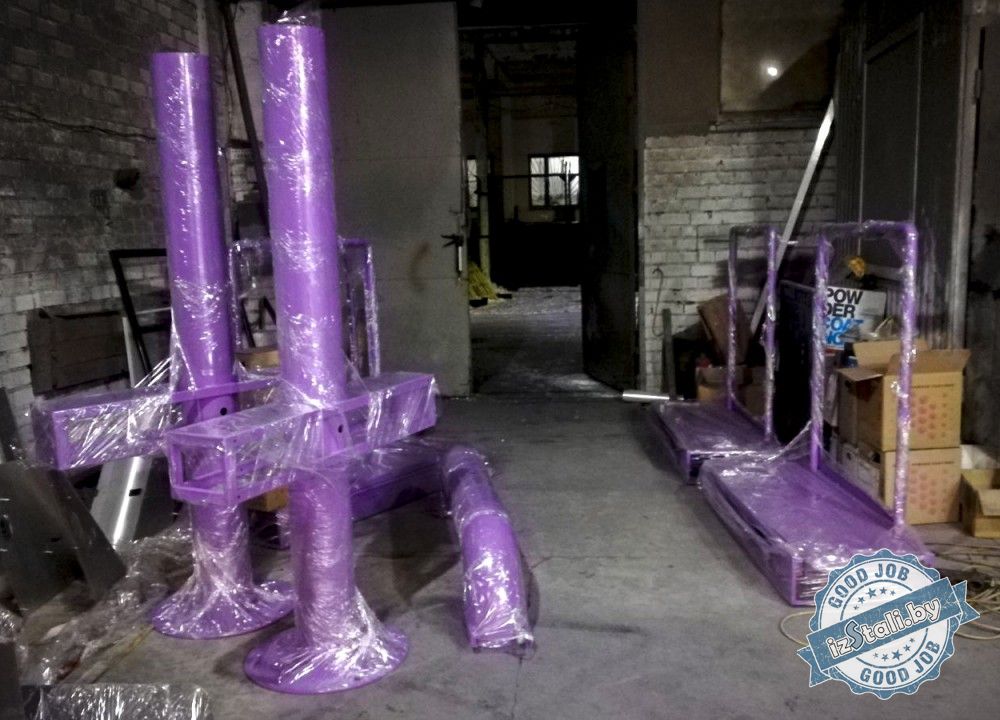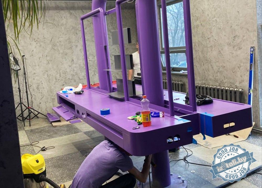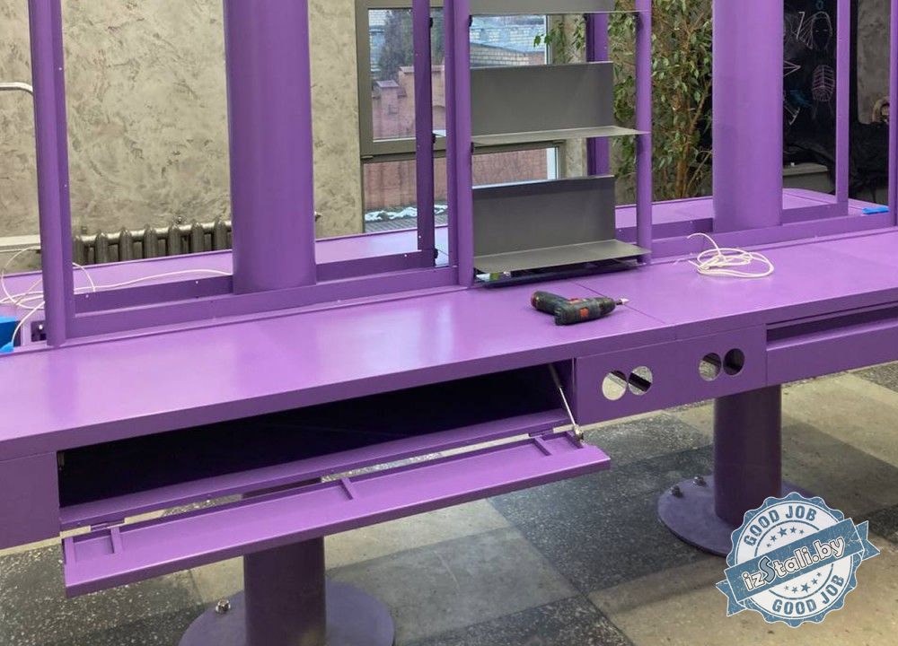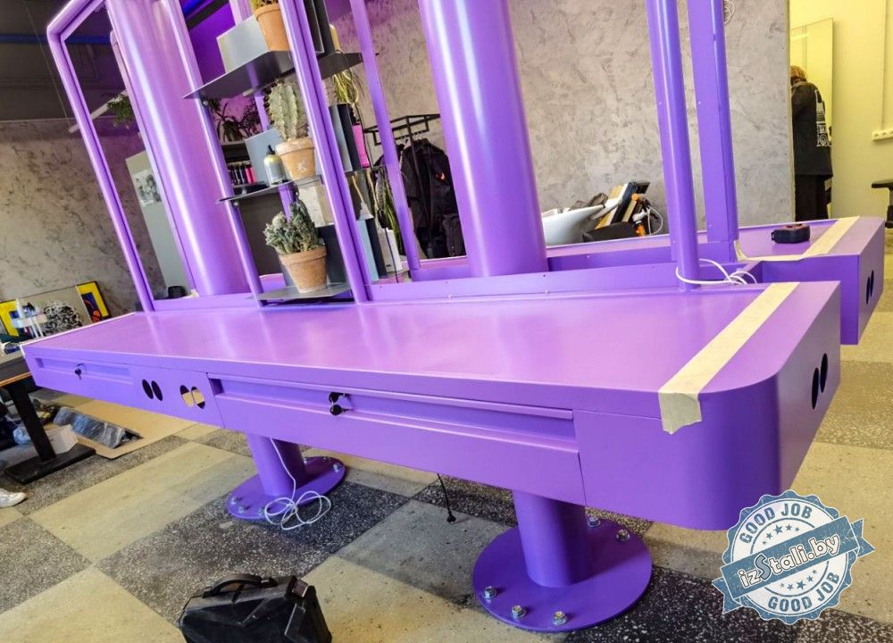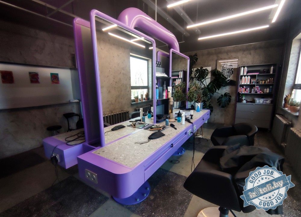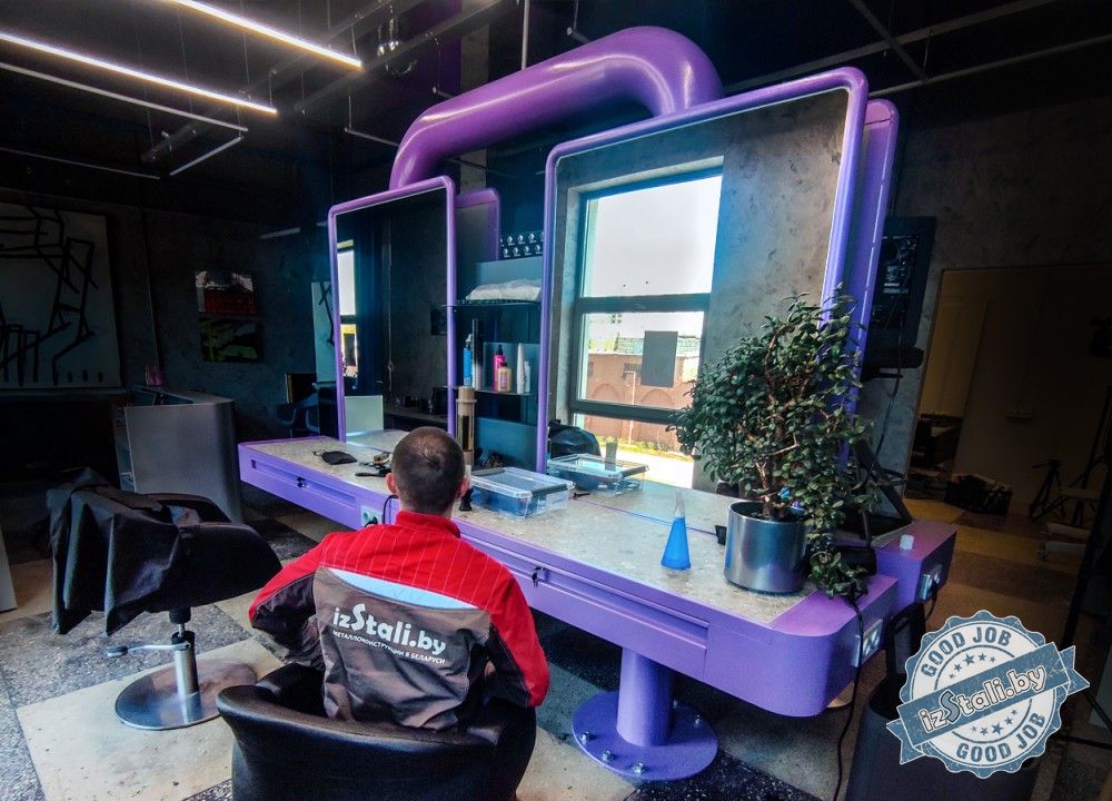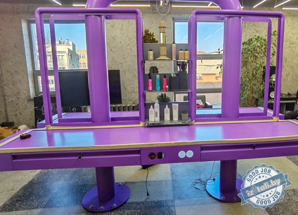 Яркий и функциональный парикмахерский стол был изготовлен под заказ по дизайнерским эскизам. Полимерная окраска металла в насыщенные яркие краски сделала это стол очень броским и привлекательным. Огромные зеркала, множество полок, встроенные розетки по периметру столешницы, каменная вставка в рабочую поверхность обеспечивают максимальную функциональность парикмахерского стола.