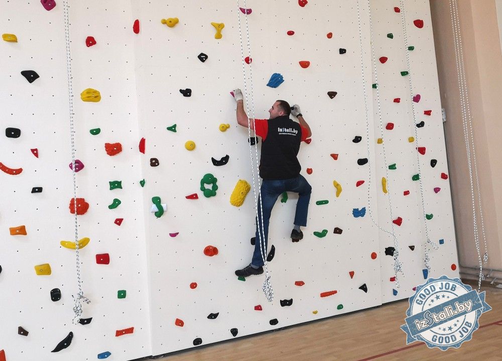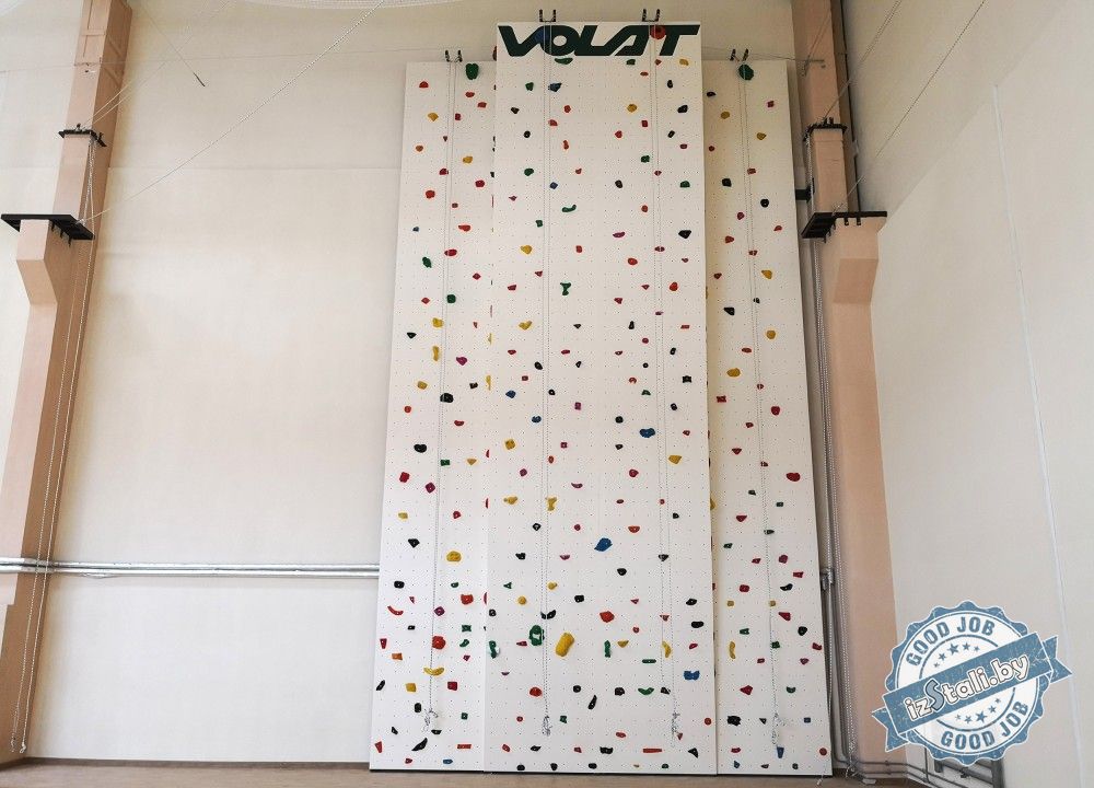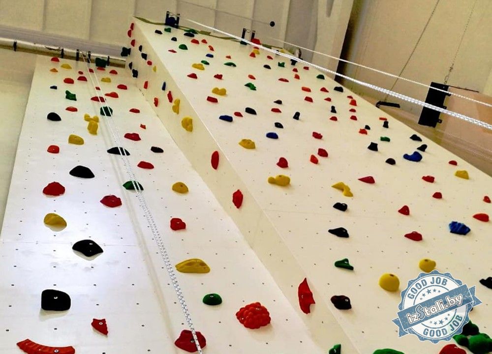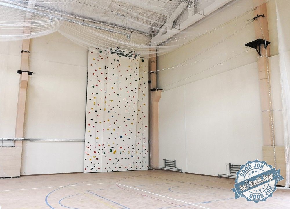Спортивный зал на Минском заводле коловых тягачей был укомплектовон современным скалодромом высотой более 10 метров и веревочными маршрутами и переправами на высоте более 7 метров.