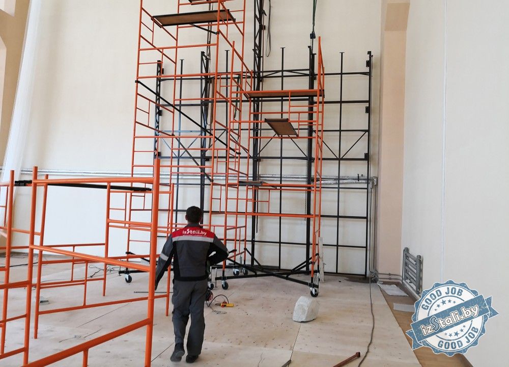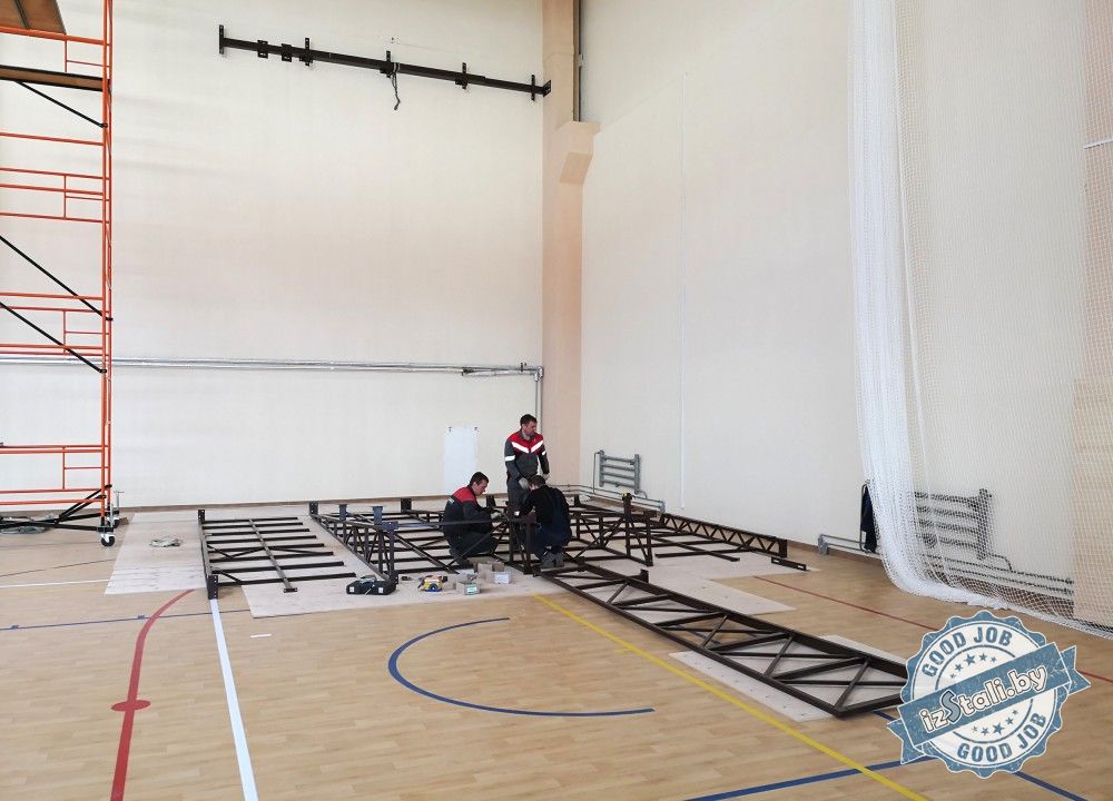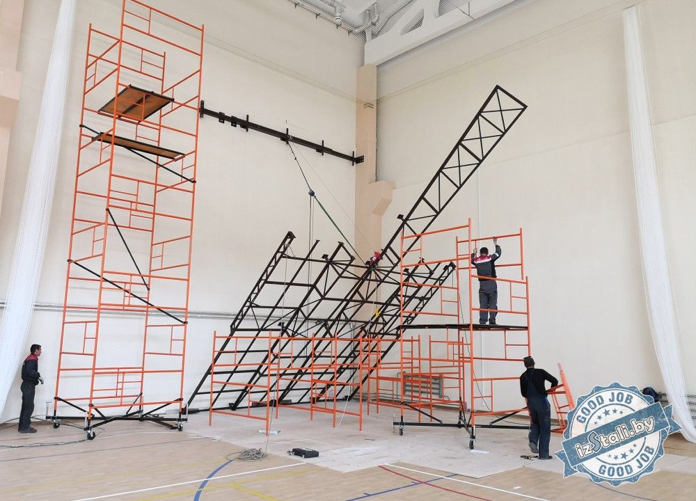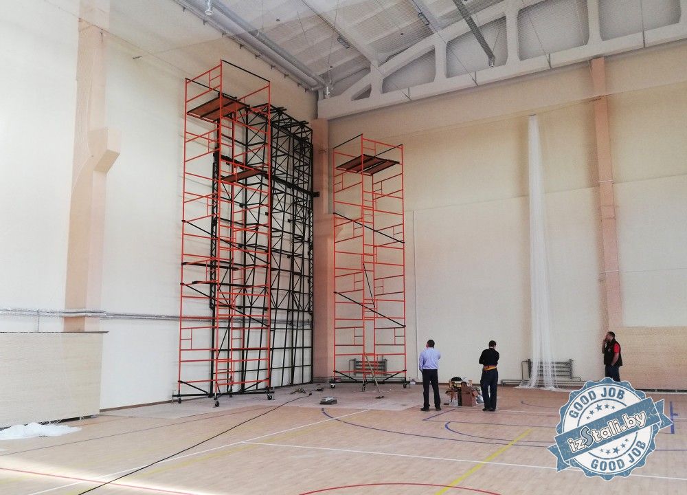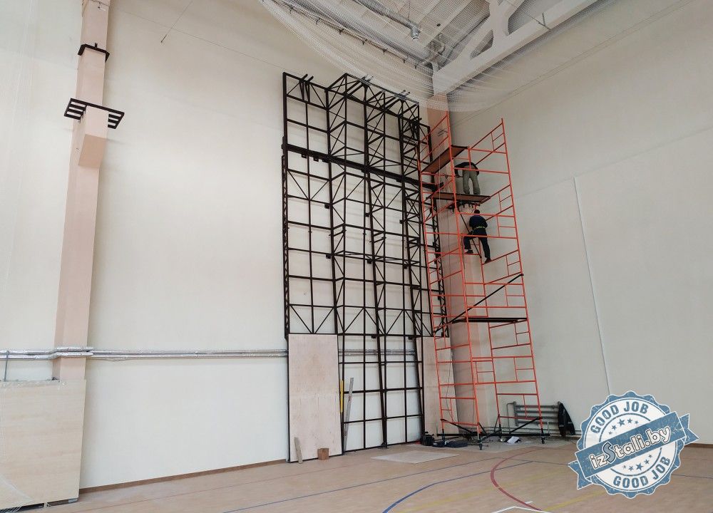 Спортивный зал на Минском заводле коловых тягачей был укомплектовон современным скалодромом высотой более 10 метров и веревочными маршрутами и переправами на высоте более 7 метров.