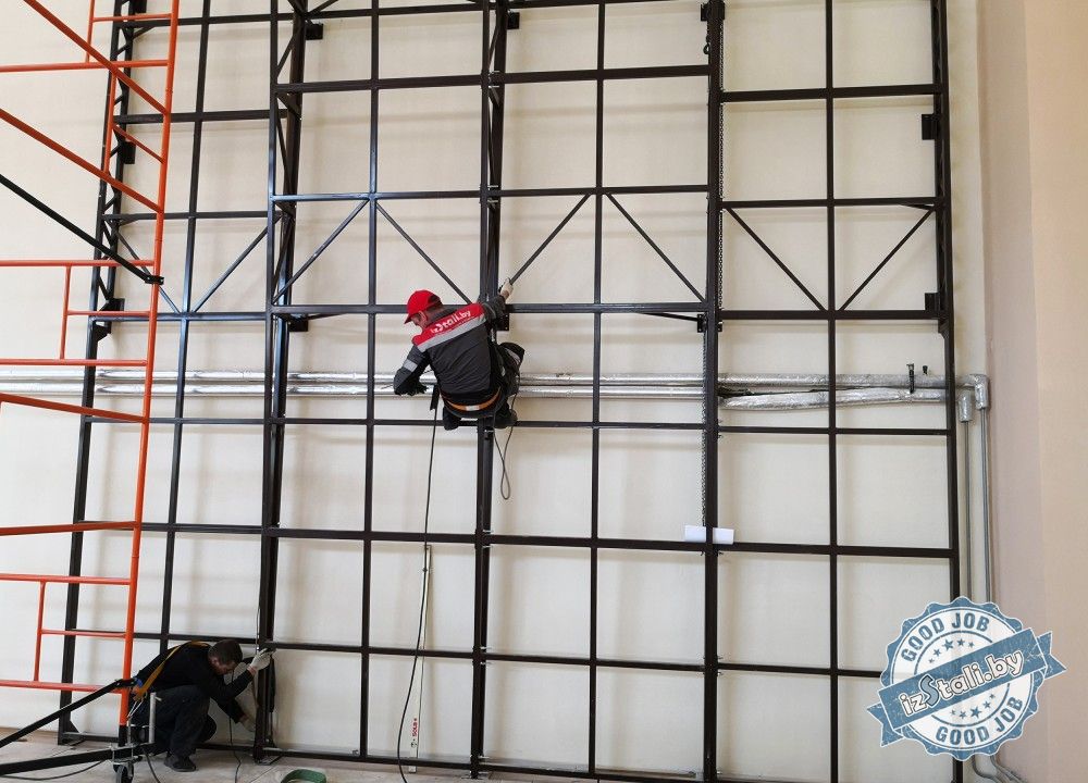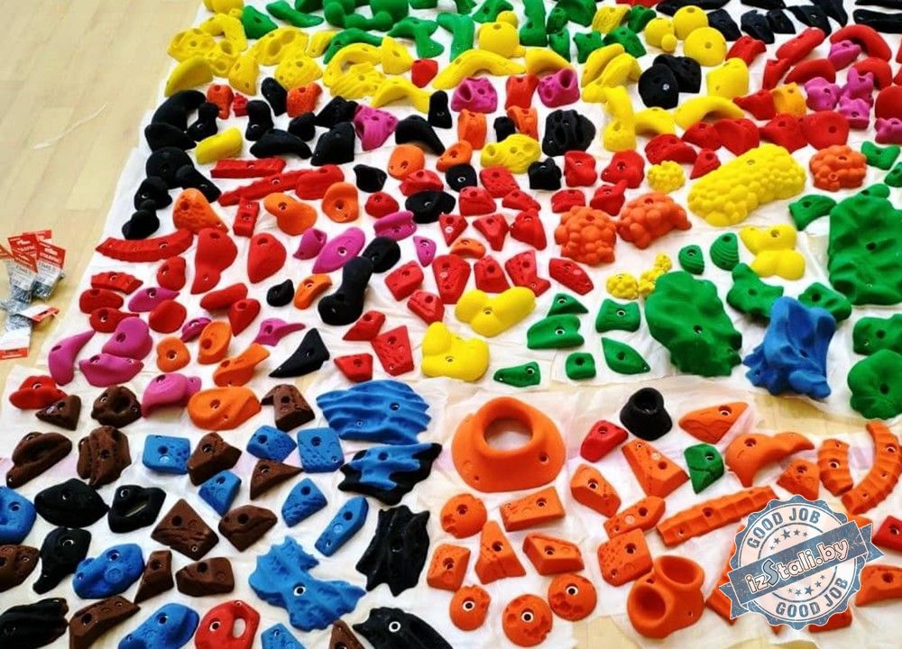 Конструкция скалодрома представляем собой прочный стальной каркас, который облицован панелями с профессиональными зацепами. Зацепы изготавливаются из смол и добавлением кварцевого песка, имеют высокую эргономичность и прочность.