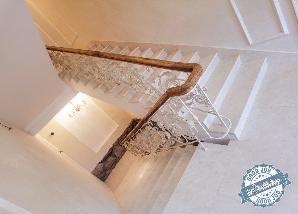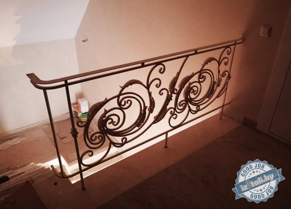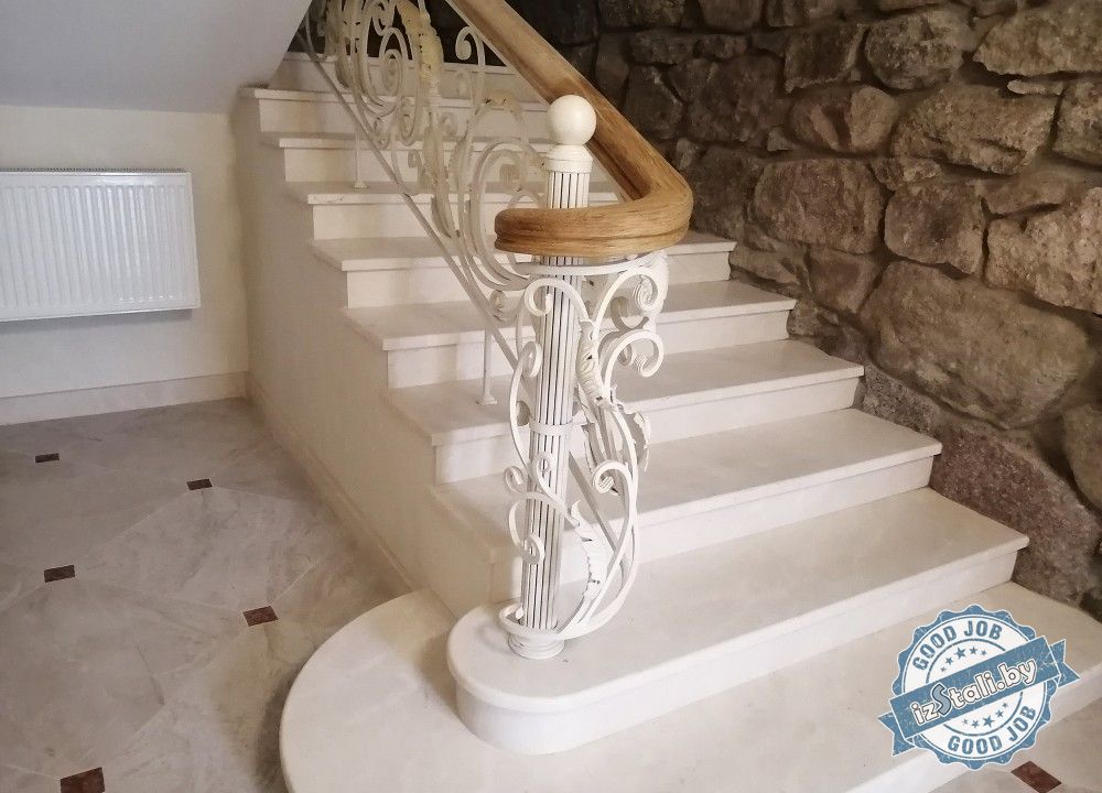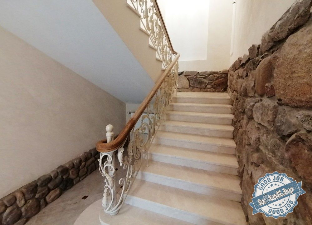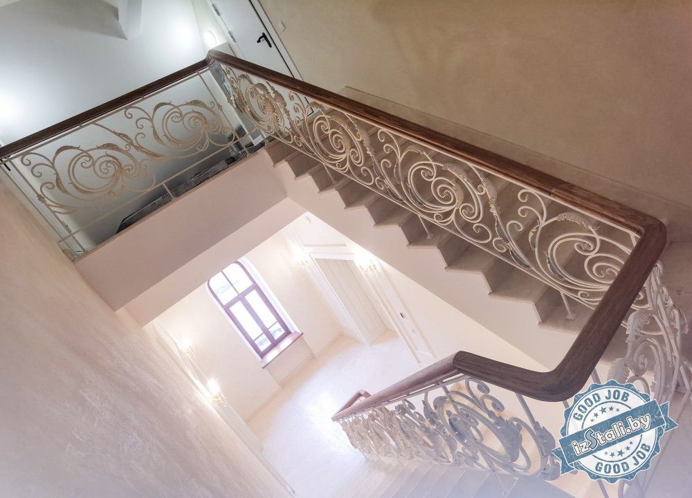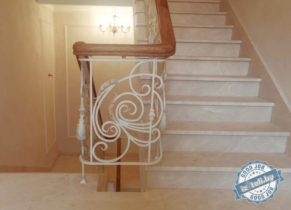 Цельнометаллическое кованное ограждение с уникальным узором из объемных элементов стало главным украшением парадной лестницы. Патенирование золотом придает коаванным элементам дополнительную выразительность и блеск. Сверху ограждение завершает объемный дубовый поручень, покрытый натуральными маслами.