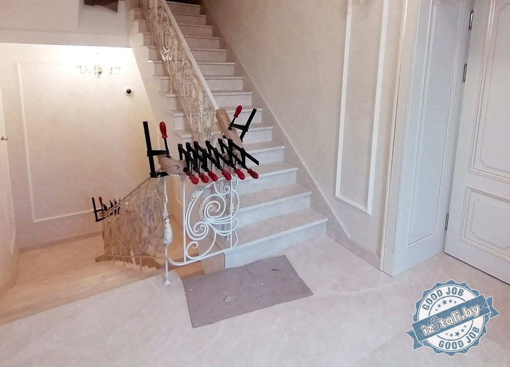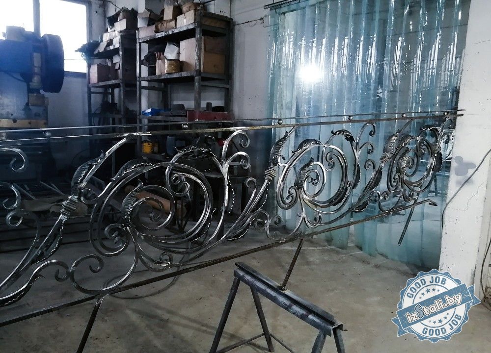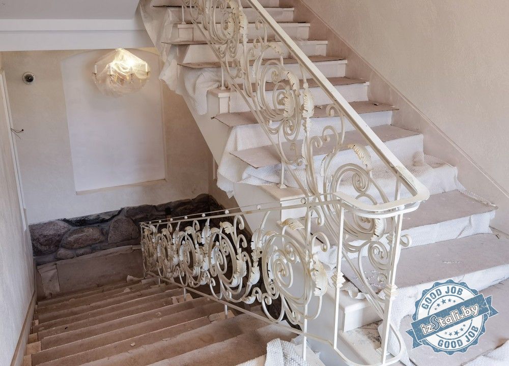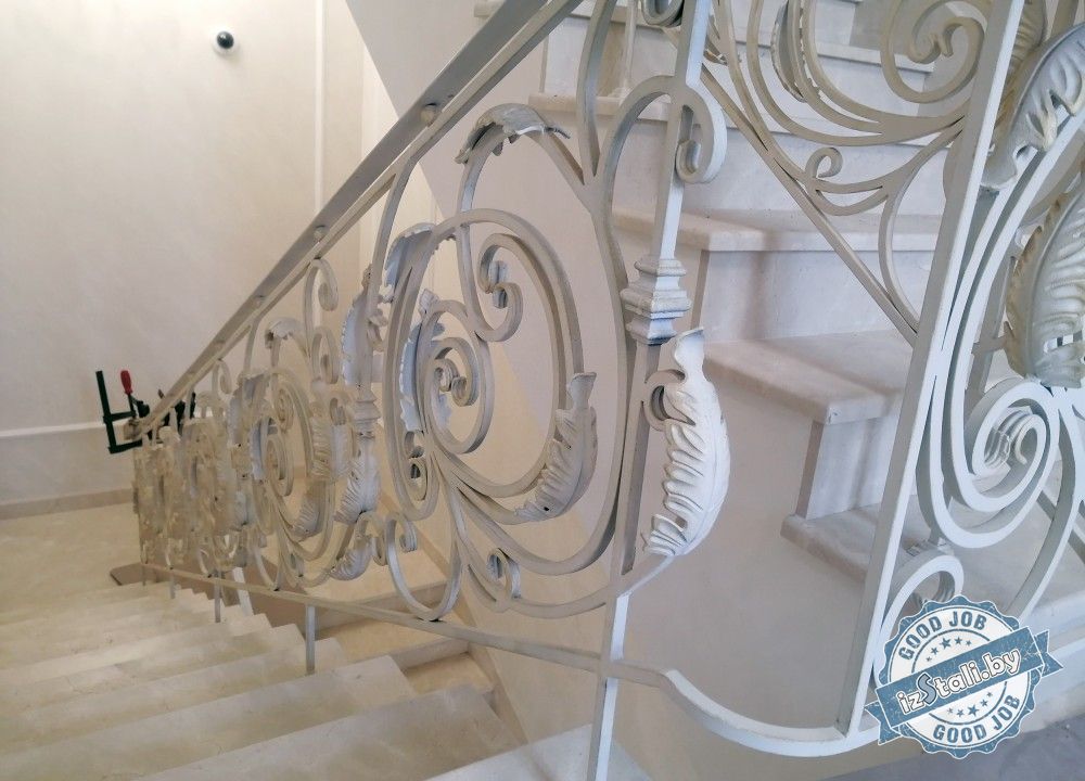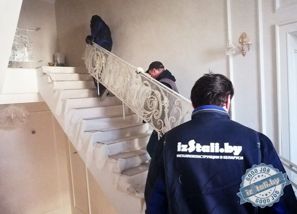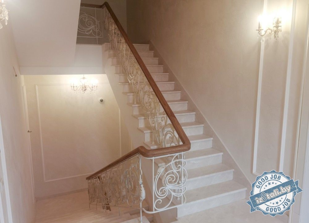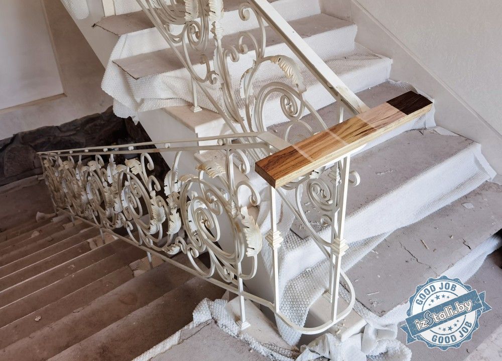 Цельнометаллическое кованное ограждение с уникальным узором из объемных элементов стало главным украшением парадной лестницы. Патенирование золотом придает коаванным элементам дополнительную выразительность и блеск. Сверху ограждение завершает объемный дубовый поручень, покрытый натуральными маслами.