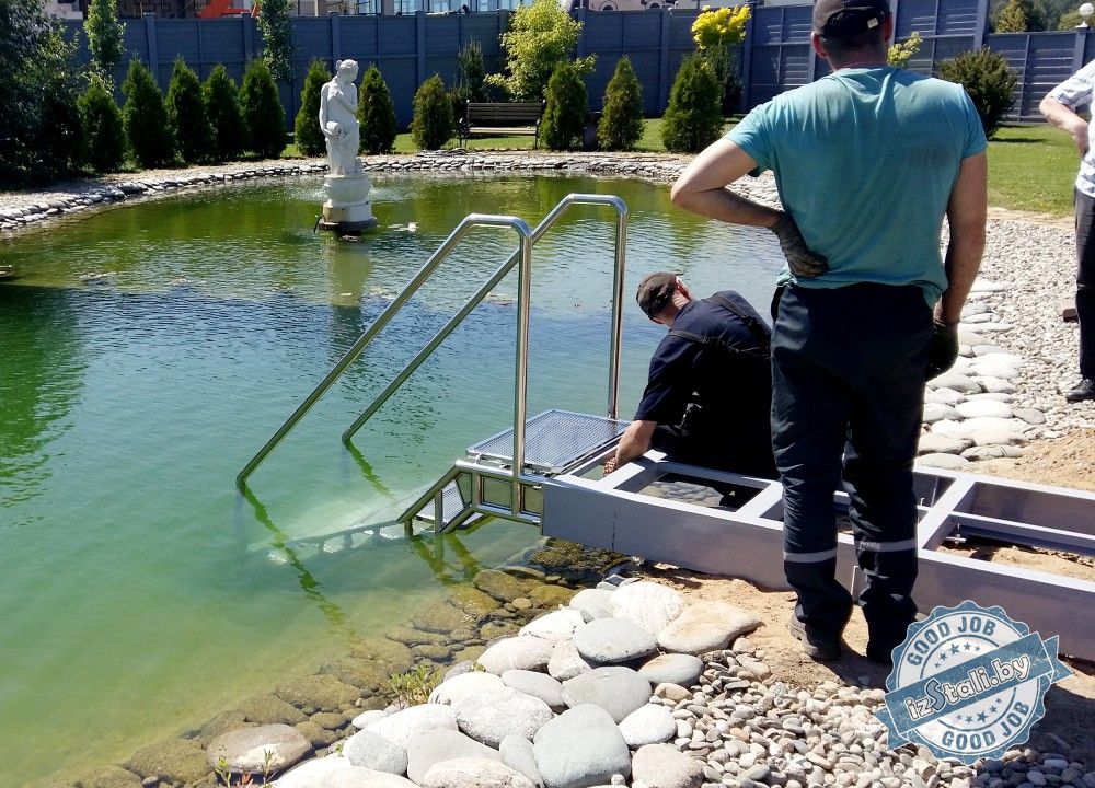Пологие и скользские уклоны искуственного пруда не обеспечивали возможность безопасного спуска и выхода человека из воды. Поэтому в воду купели установили лестницу из нержавеющей стали.