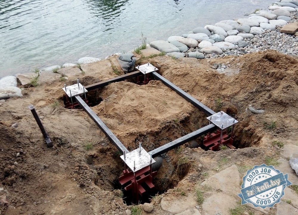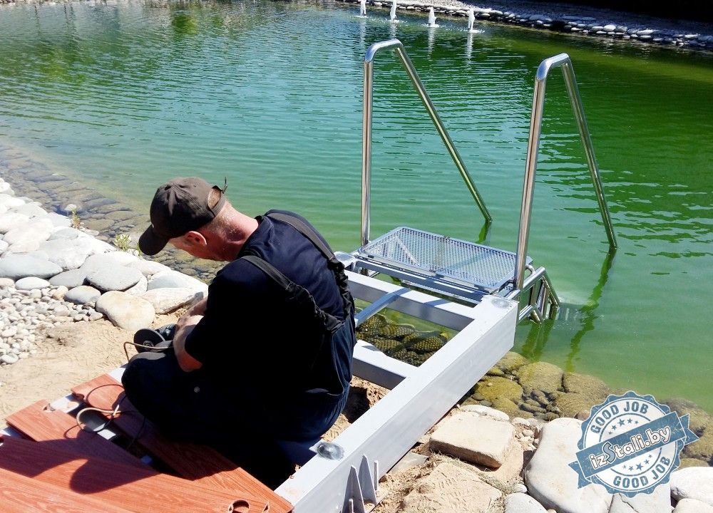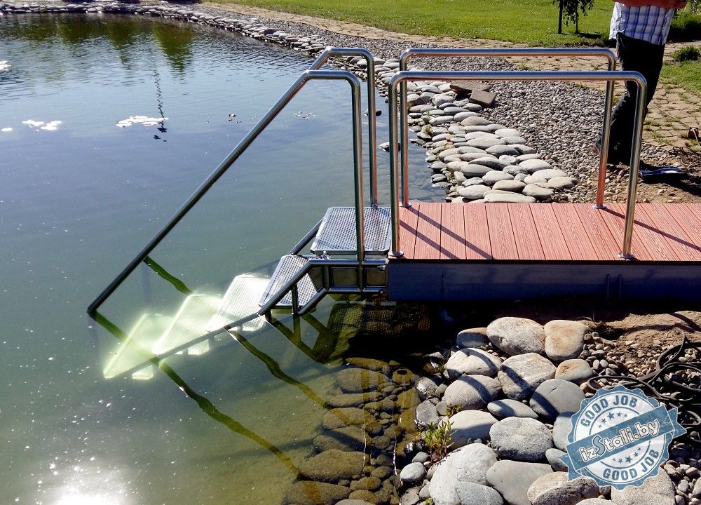 Чтобы не повредить гидроизоляционную мембрану пруда, лестница в купель имееет консольное крепление над поверхностью воды. Для этого на берегу пруда на фундаментных блоках установлен мощный металлокаркас, представляющий собой площадку. Напольное покрытие площадки выполнено из композитной террасной доски, которая устойчива к атмосферным воздействиям.