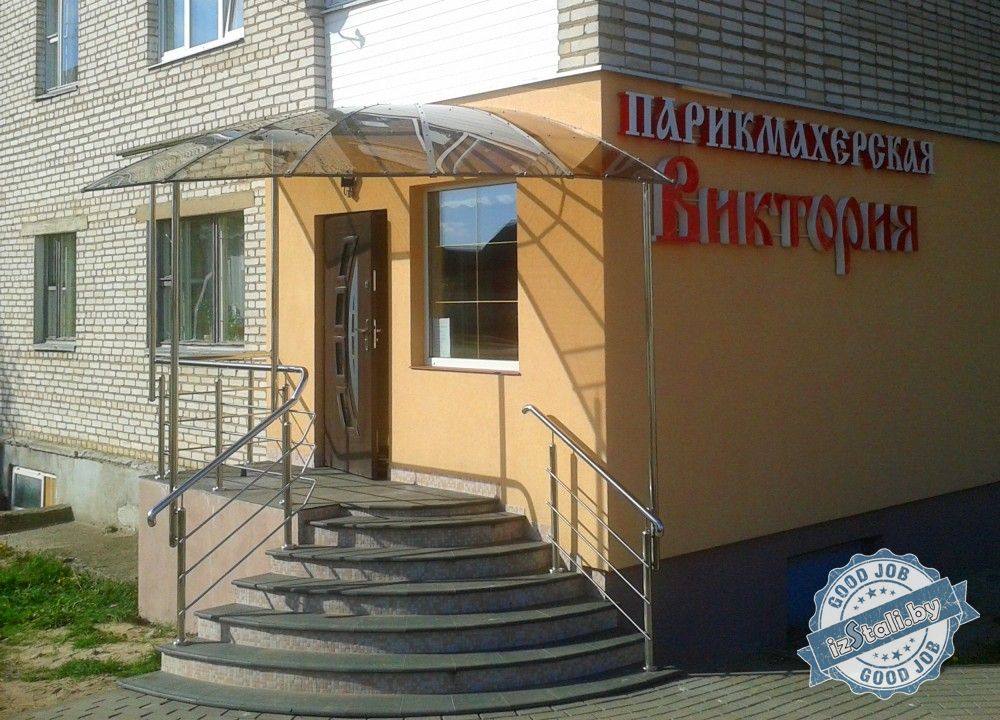 Навес изготовлен из нержавеющей стали с покрытием монолитным поликарбонатом и монтаж ограждения из нержавейки у входа в парикмахерскую "Виктория".