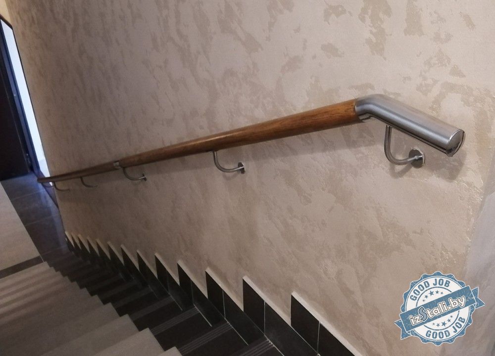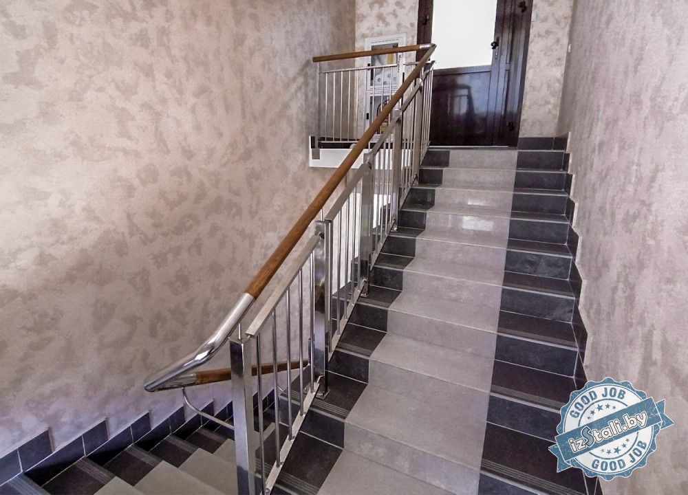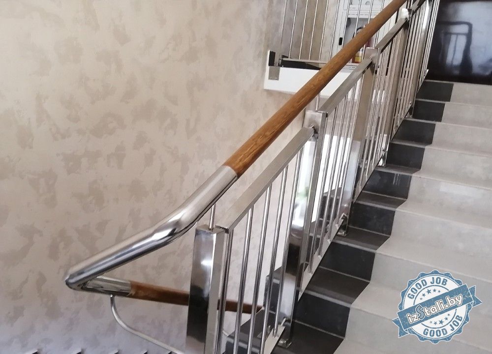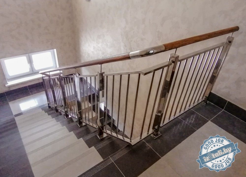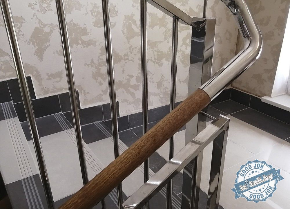 В качестве ограждений лестницы были установлены комбинированные перила из нержавеющей стали с дубовыми порунями. Решетчатое заполнение ограждения представляет собой частокол из вертикальных прутков.