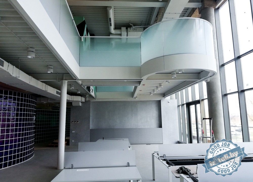 В качестве защиты на балконах антресольного этажа установлено ограждение из закаленного стекла. На радиусных балкончиках ограждение выполнено из гнутого закаленного стекла радиусом 1200мм. По верху стекло связано дубовым поручнем с окраской акриловыми красками. Поручень ф40мм выделяет верхнюю кромку ограждений и придает ему дополнительную жесткость. В качестве градиентной тонировки и дополнительной защиты от высыпания стекло покрыто пленкой с фотопечатью.