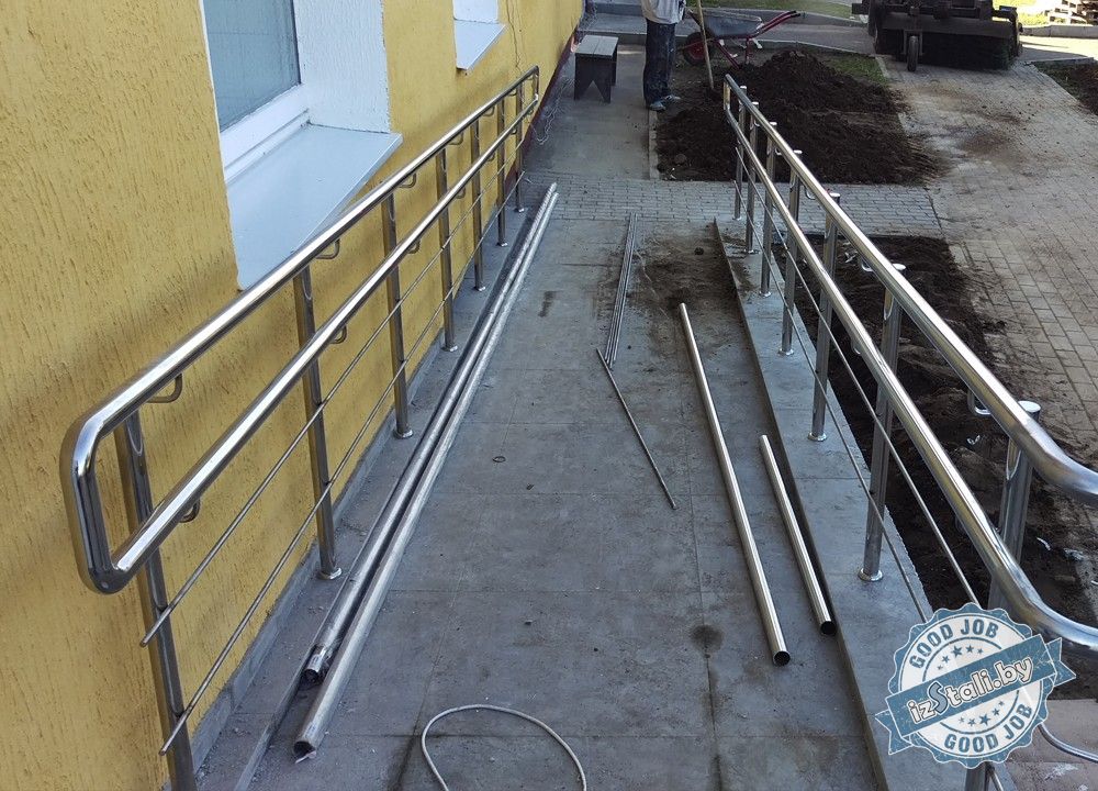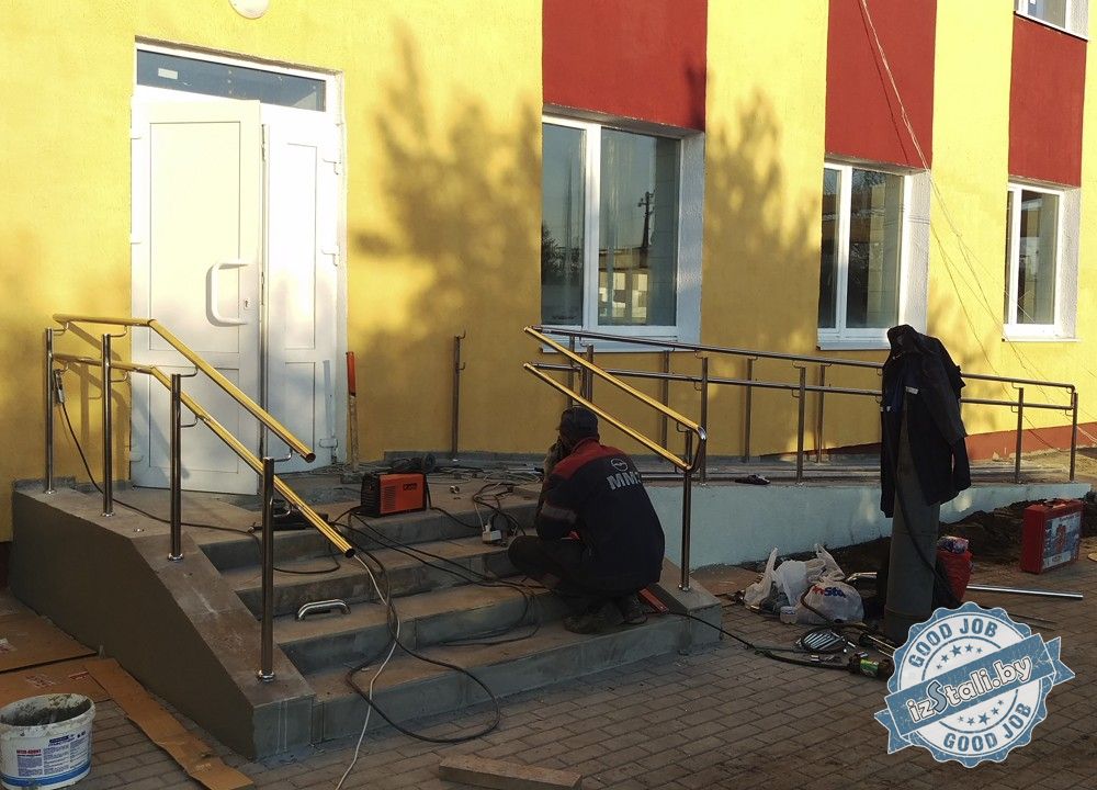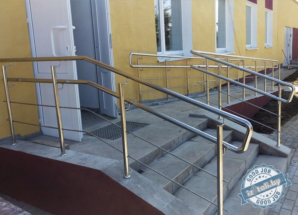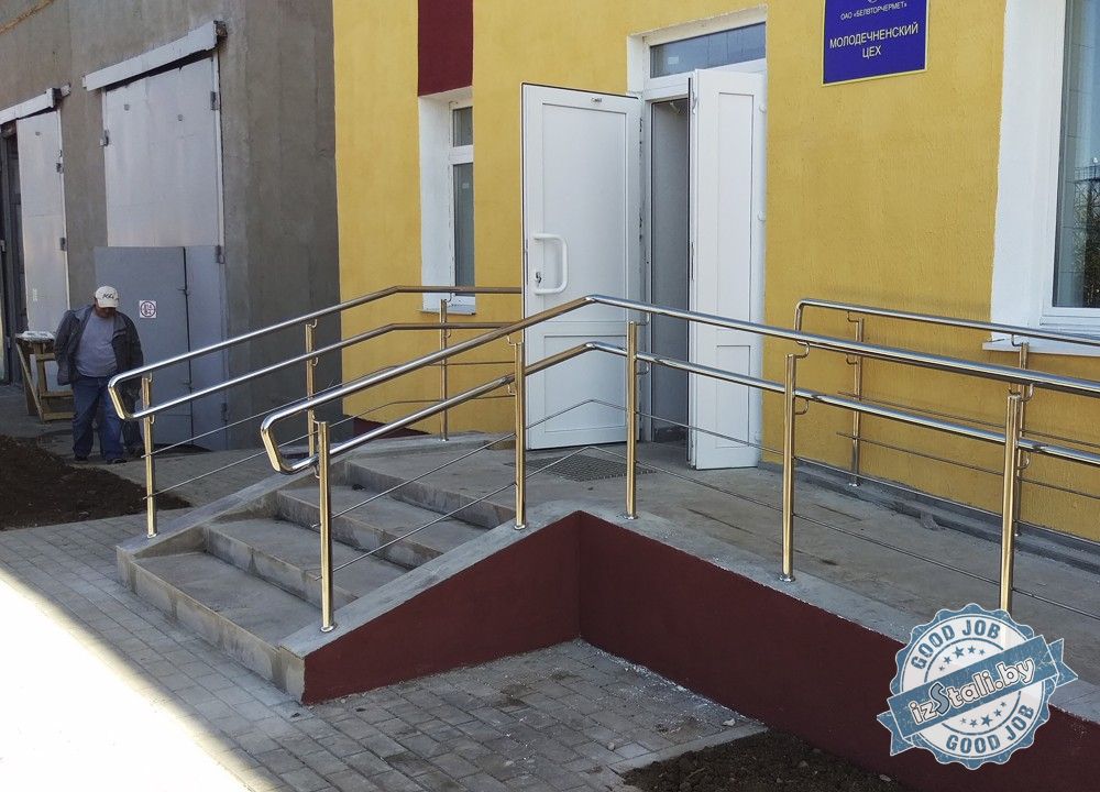 Ограждения из нержавеющей стали были смонтированы на внутренних лестницах, а также на крыльце и пандусе входной группы. Зеркальная поверхность материала впитала в себя все окружающие краски и гармонично вписалась в интерьер и экстерьер здания, придав ему законченный современный вид. Изделие способно сохранить свой изящный внешний вид свыше 50 лет.