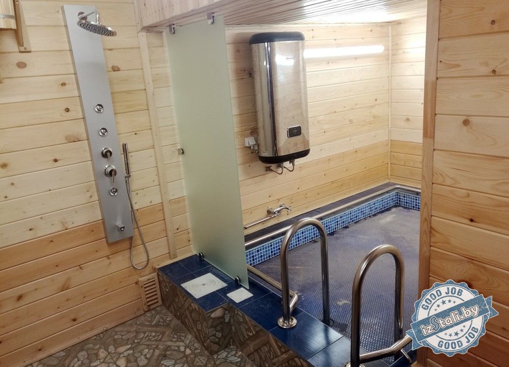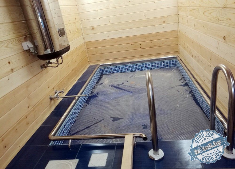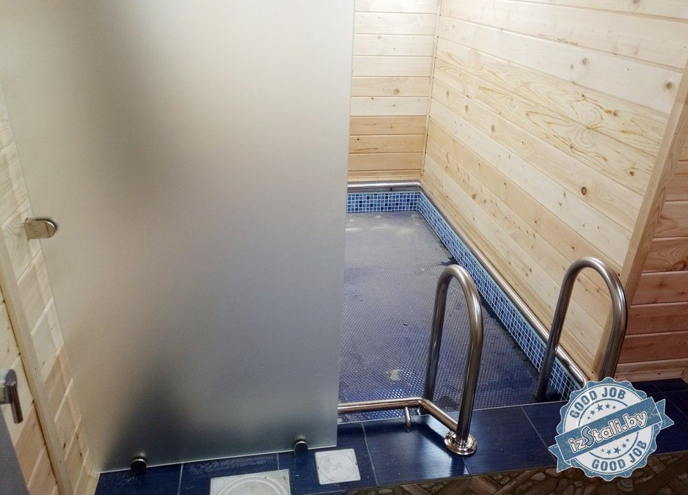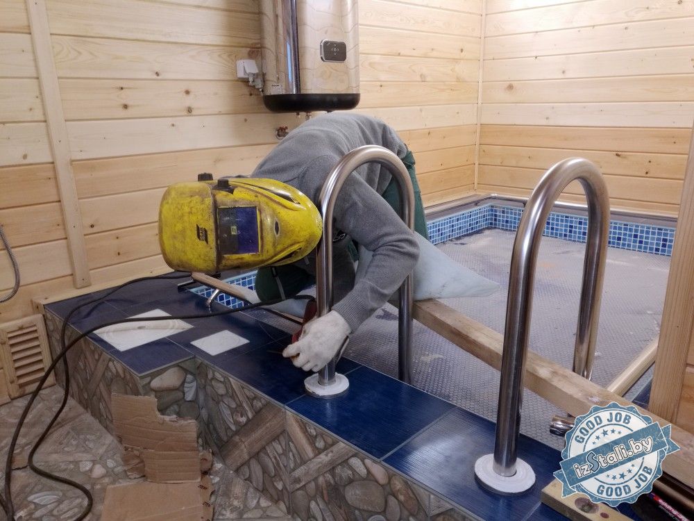 Поставленной задачей было оснастить периметр бассейна поручнем, обеспечить безопасный спуск в бассейн и установить защитный экран бассейна от зоны мойки.