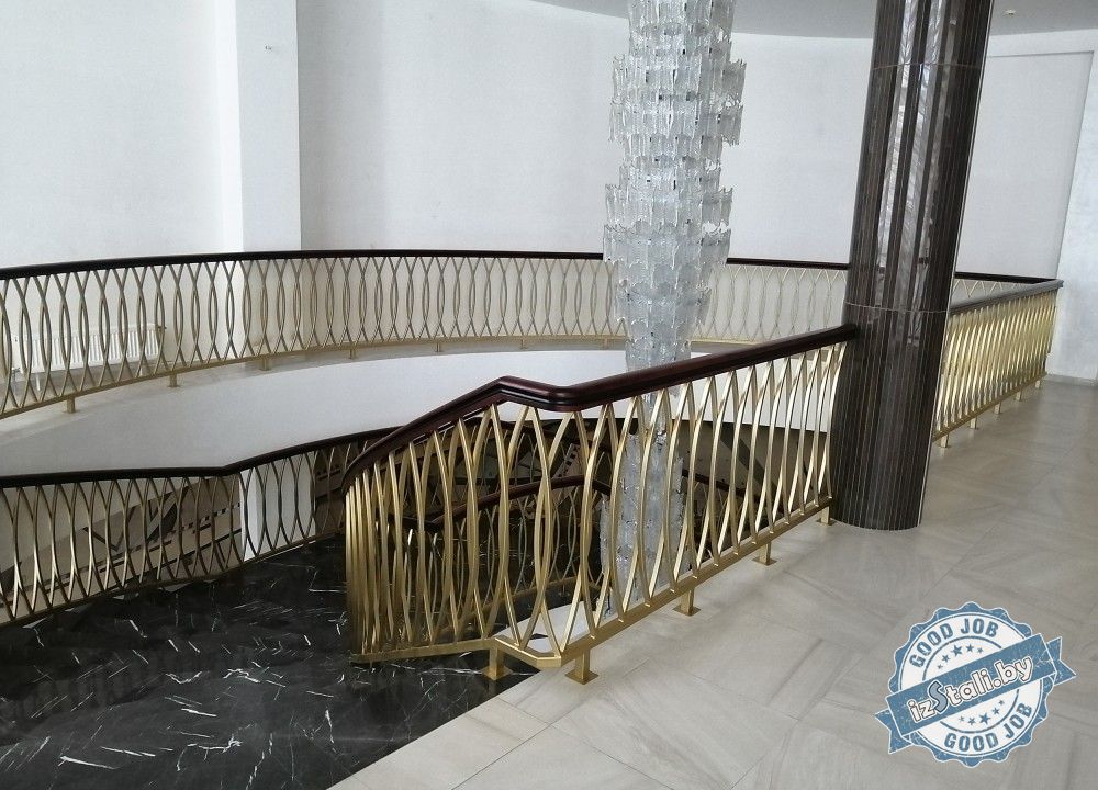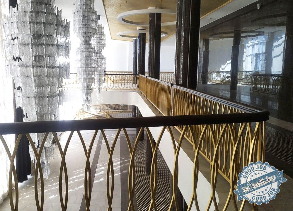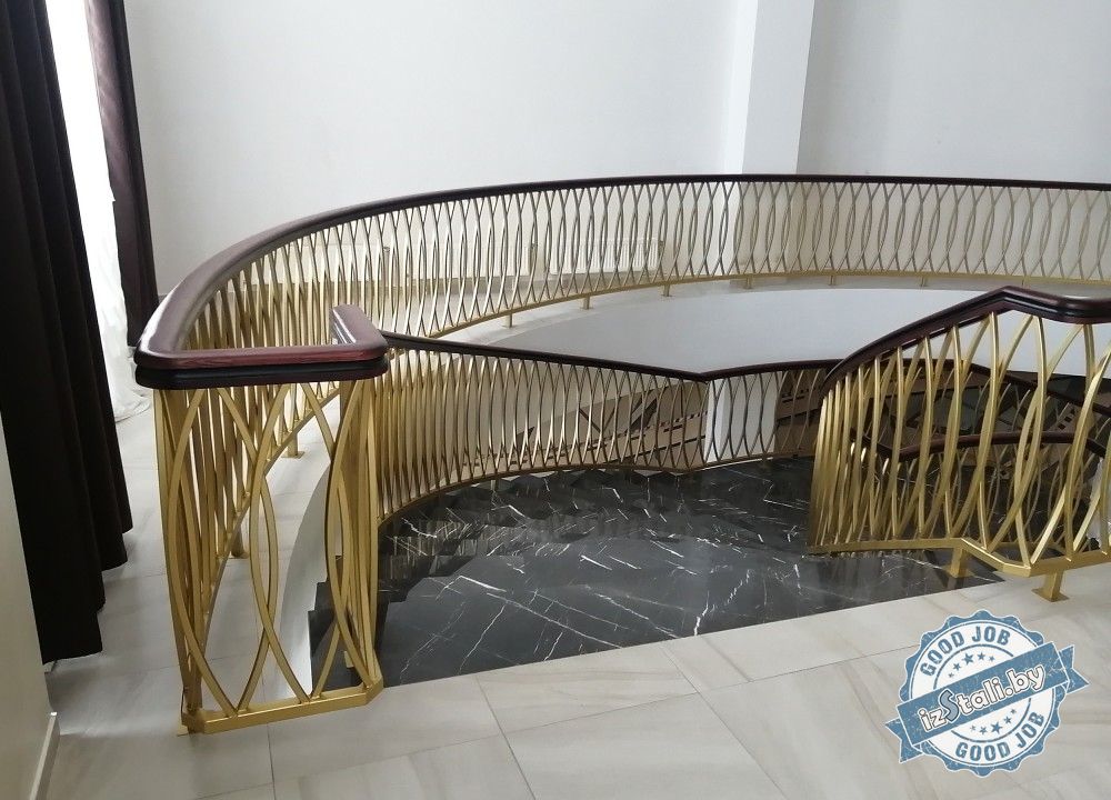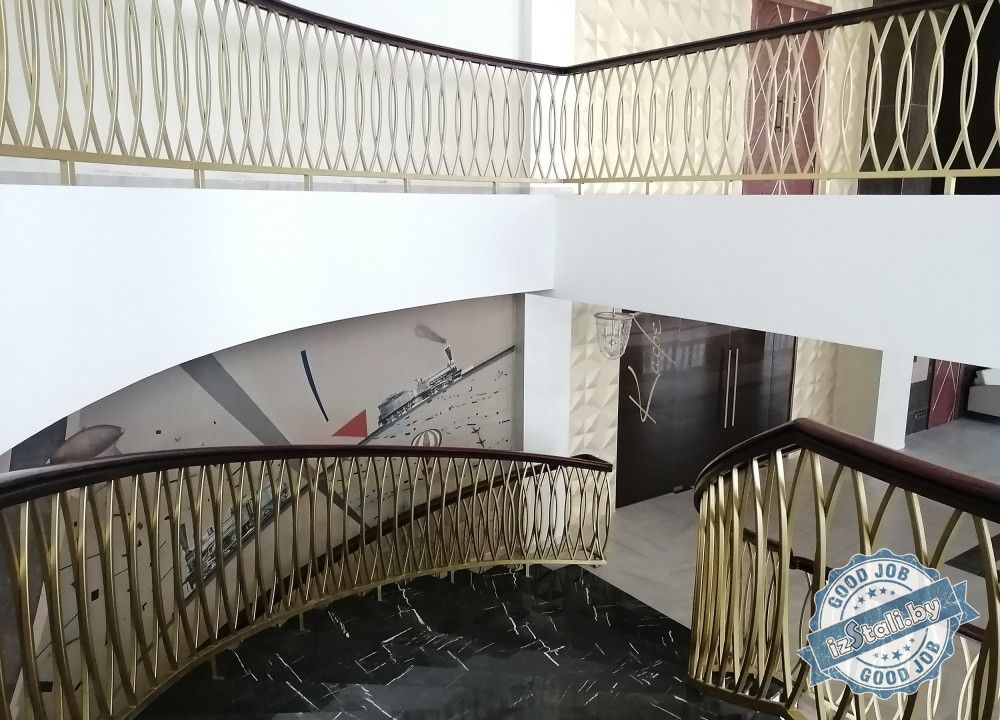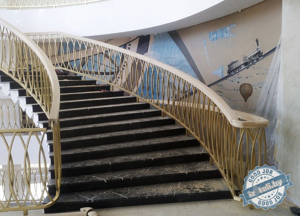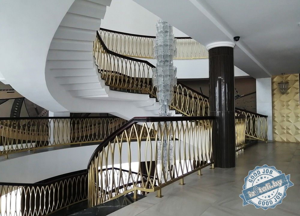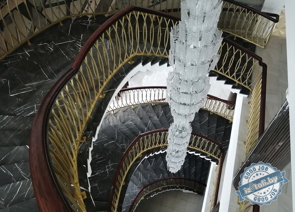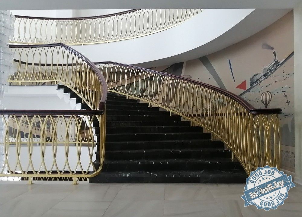 Массивная винтовая лестница с золотым ограждением является основным архитектурным элементом Дворца культуры железной дороги. Несущая часть выполнена из монолитного железобетона, обеспечивающего надежность, прочность и долговечность лестничных маршей. Ступени лестницы отделаны натуральным камнем темного цвета с уникальным рисунком. Прочные стальные перила объемной формы покрыты эмалью под золото и надежно ограждают винтовую лестницу и проем второго света от падения. Сверху ограждений установлен объемный массивный деревянный поручень из ясеня. Комбинация таких материалов и фактур делает винтовую лестницу настоящим украшением дворца.