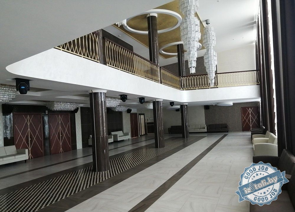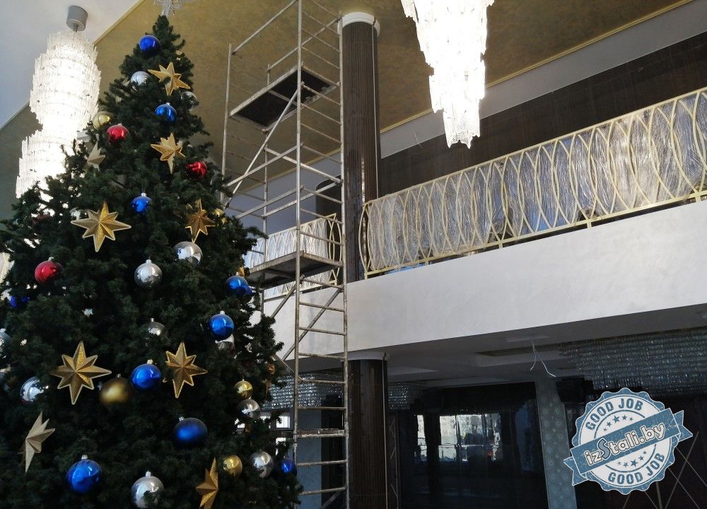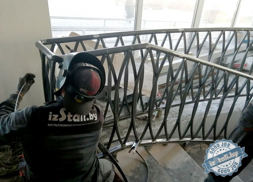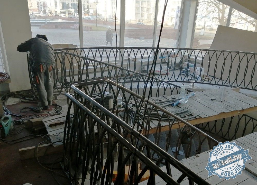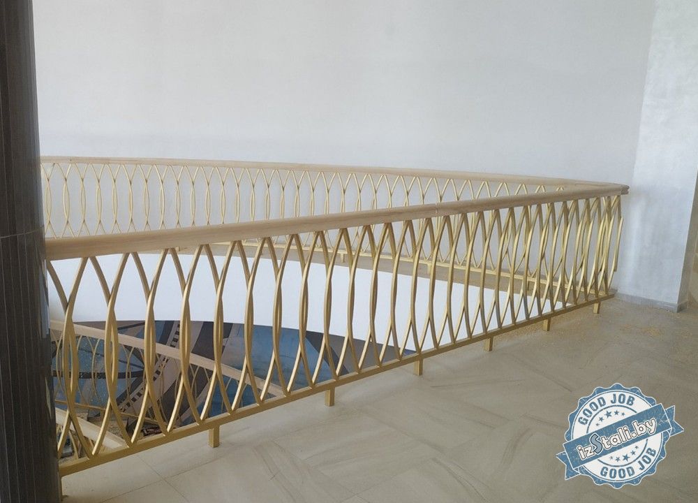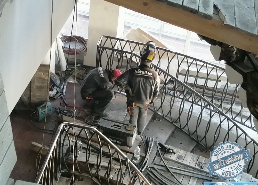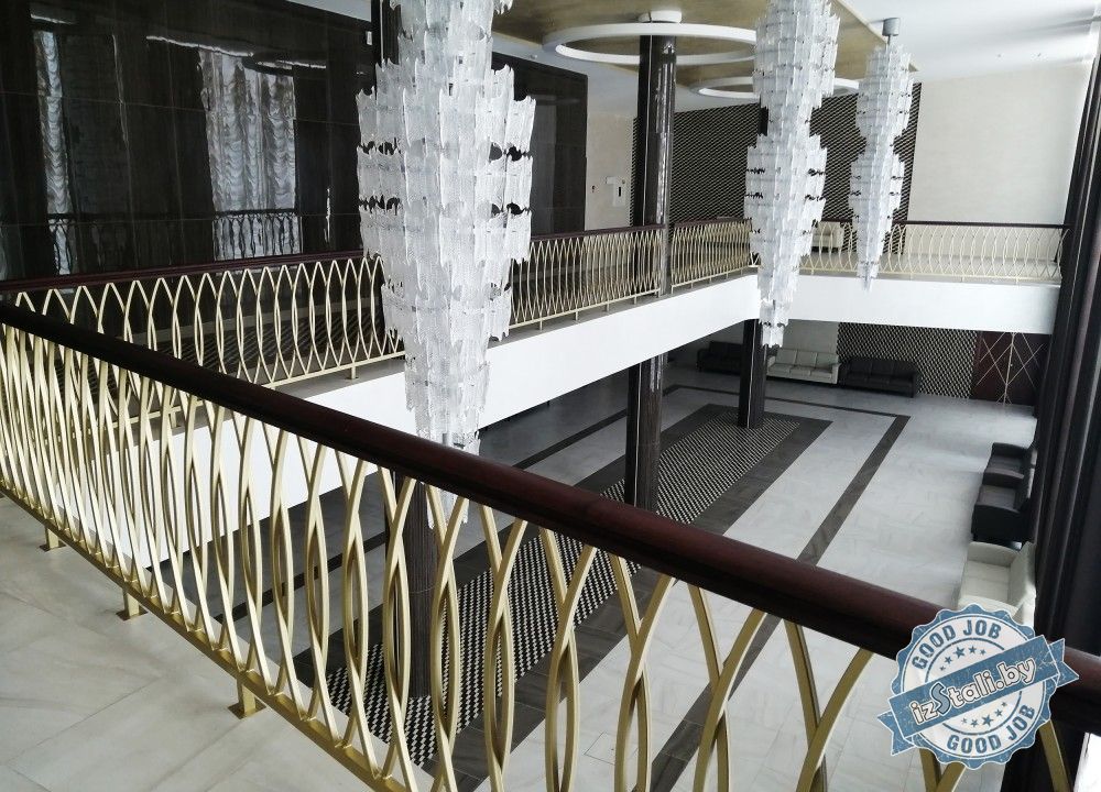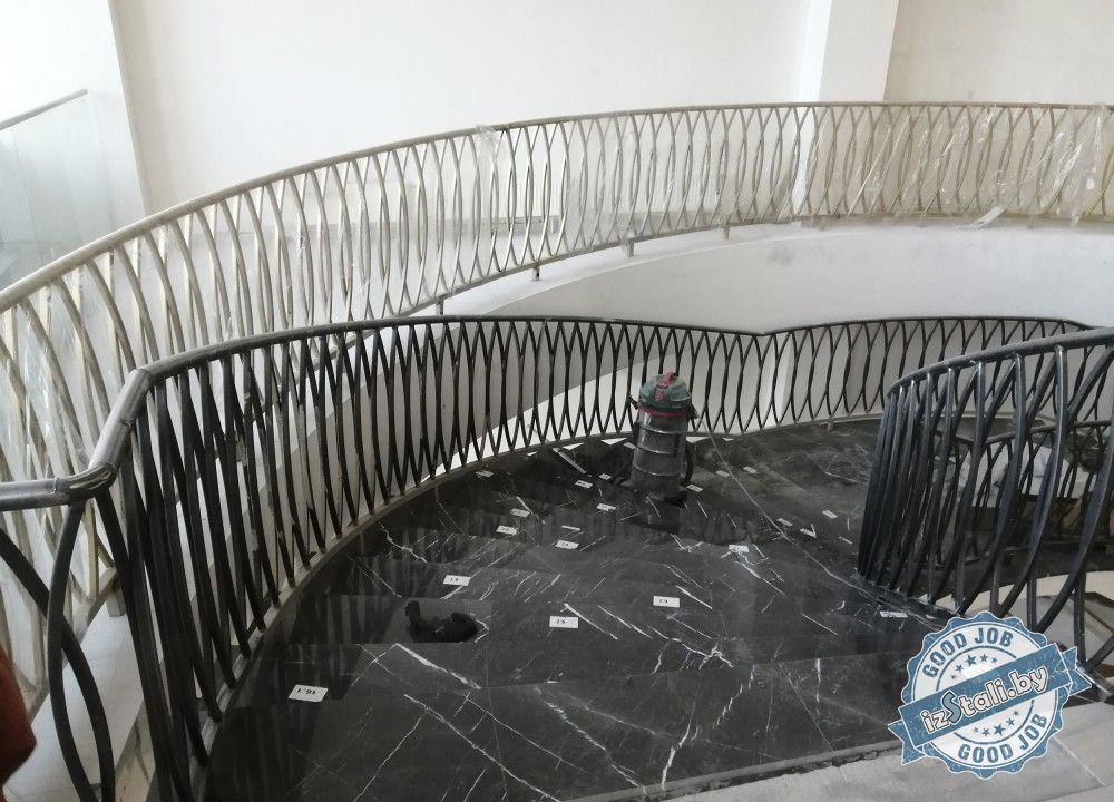 Массивная винтовая лестница с золотым ограждением является основным архитектурным элементом Дворца культуры железной дороги. Несущая часть выполнена из монолитного железобетона, обеспечивающего надежность, прочность и долговечность лестничных маршей. Ступени лестницы отделаны натуральным камнем темного цвета с уникальным рисунком. Прочные стальные перила объемной формы покрыты эмалью под золото и надежно ограждают винтовую лестницу и проем второго света от падения. Сверху ограждений установлен объемный массивный деревянный поручень из ясеня. Комбинация таких материалов и фактур делает винтовую лестницу настоящим украшением дворца.